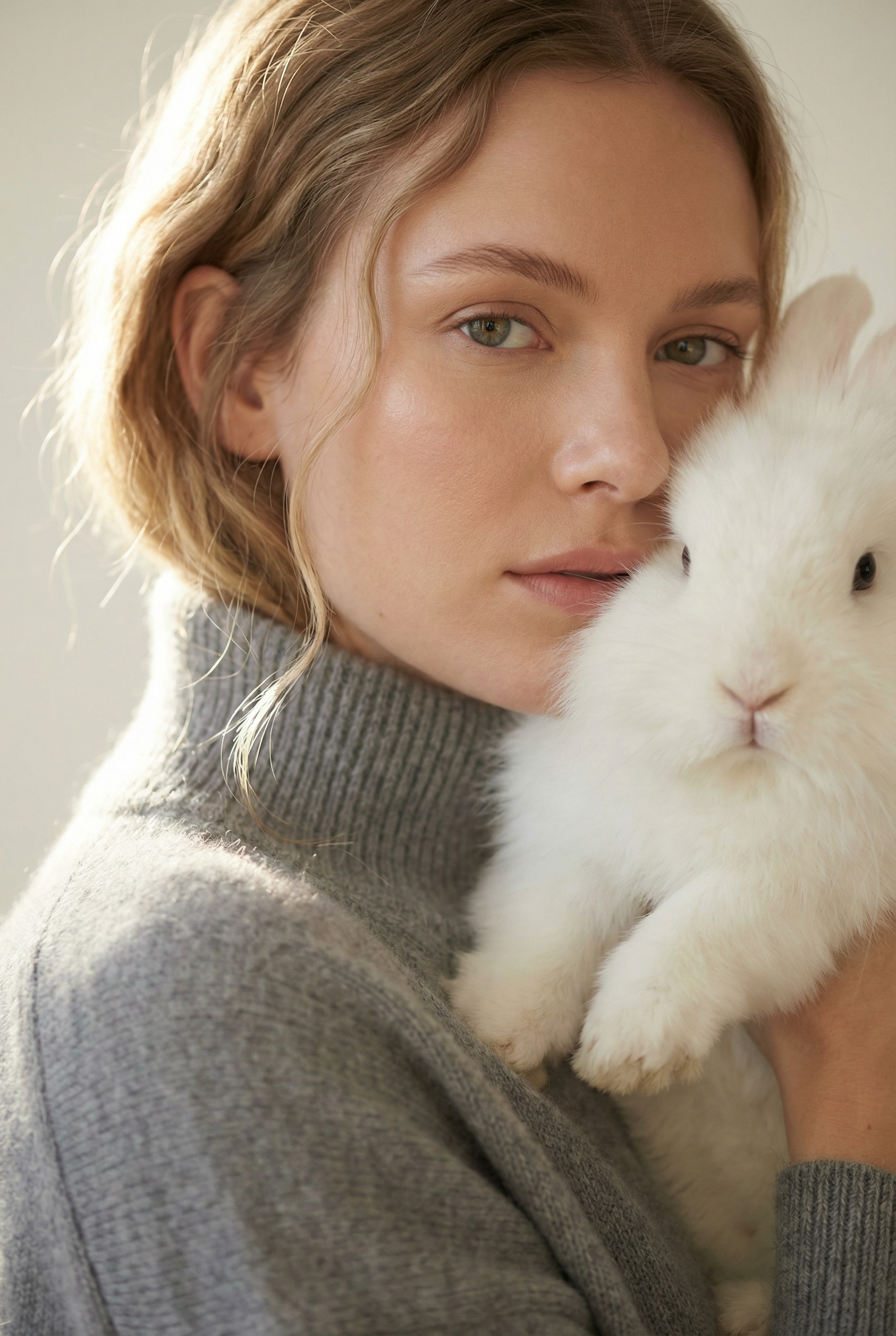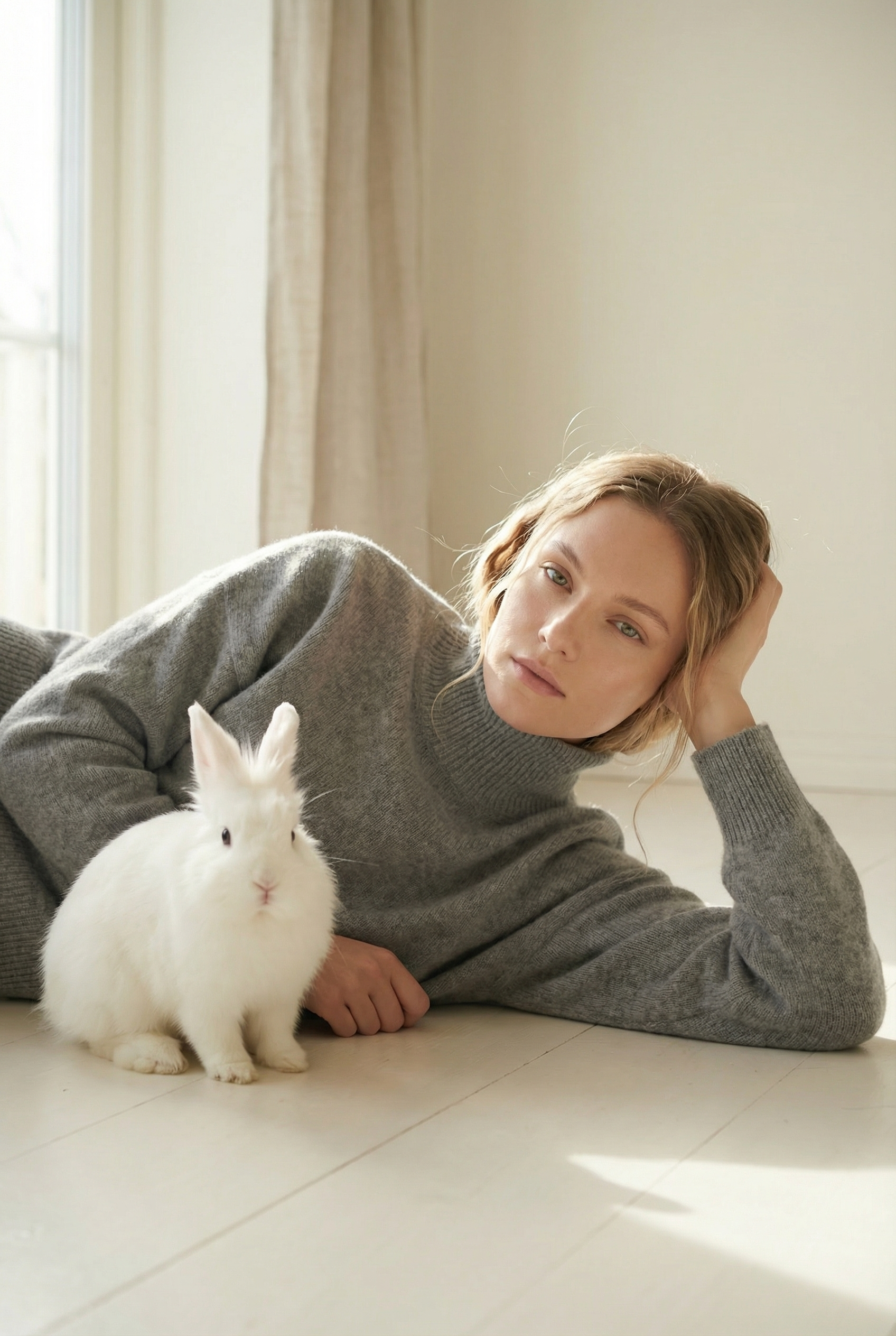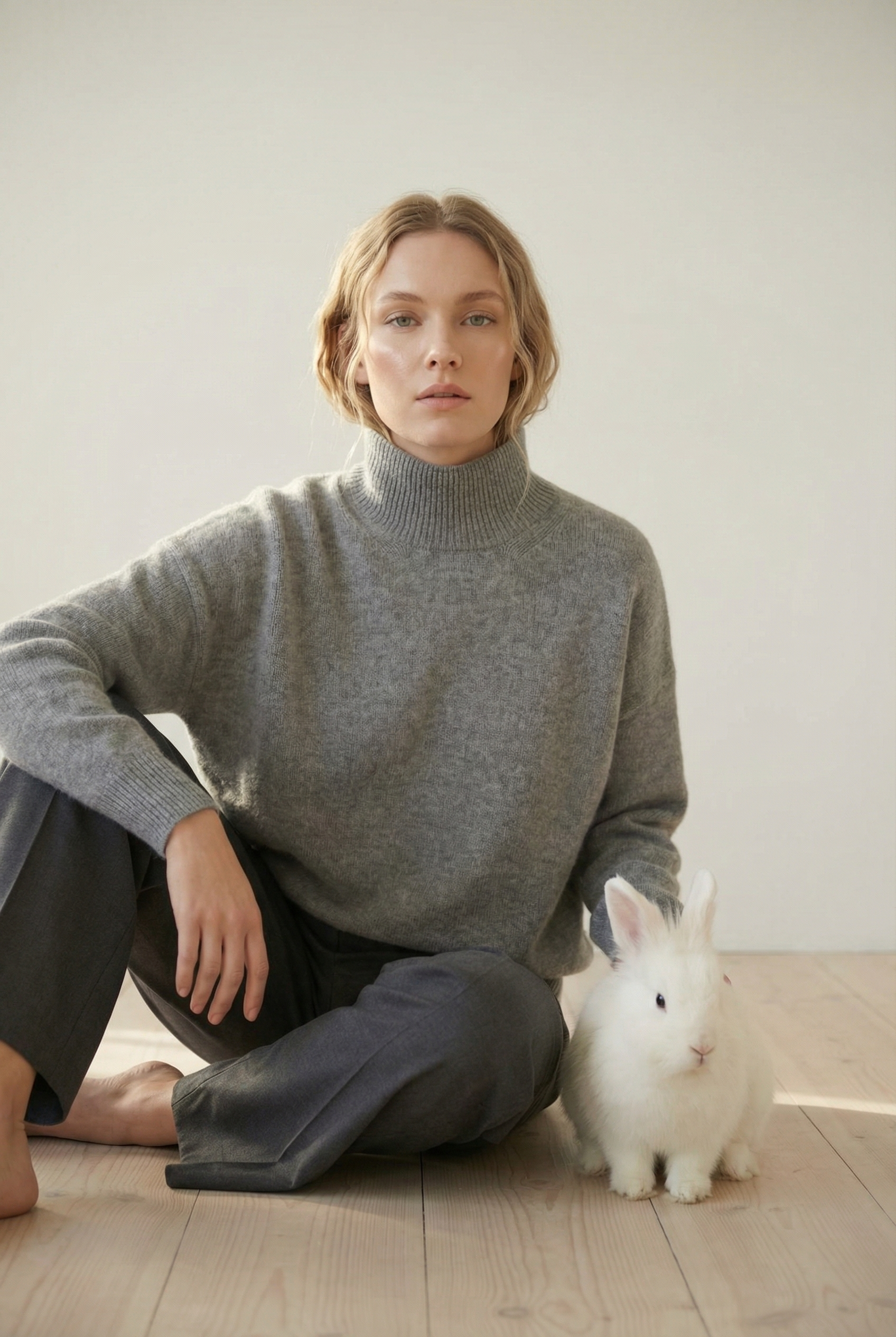 Идея пришла от материала: свитер из ангорской шерсти — значит в кадре должен быть ангорский кролик. Не как реквизит, а как визуальная рифма. Мягкий дневной свет, нейтральный интерьер, никакого лишнего — только серый, белый и тепло.