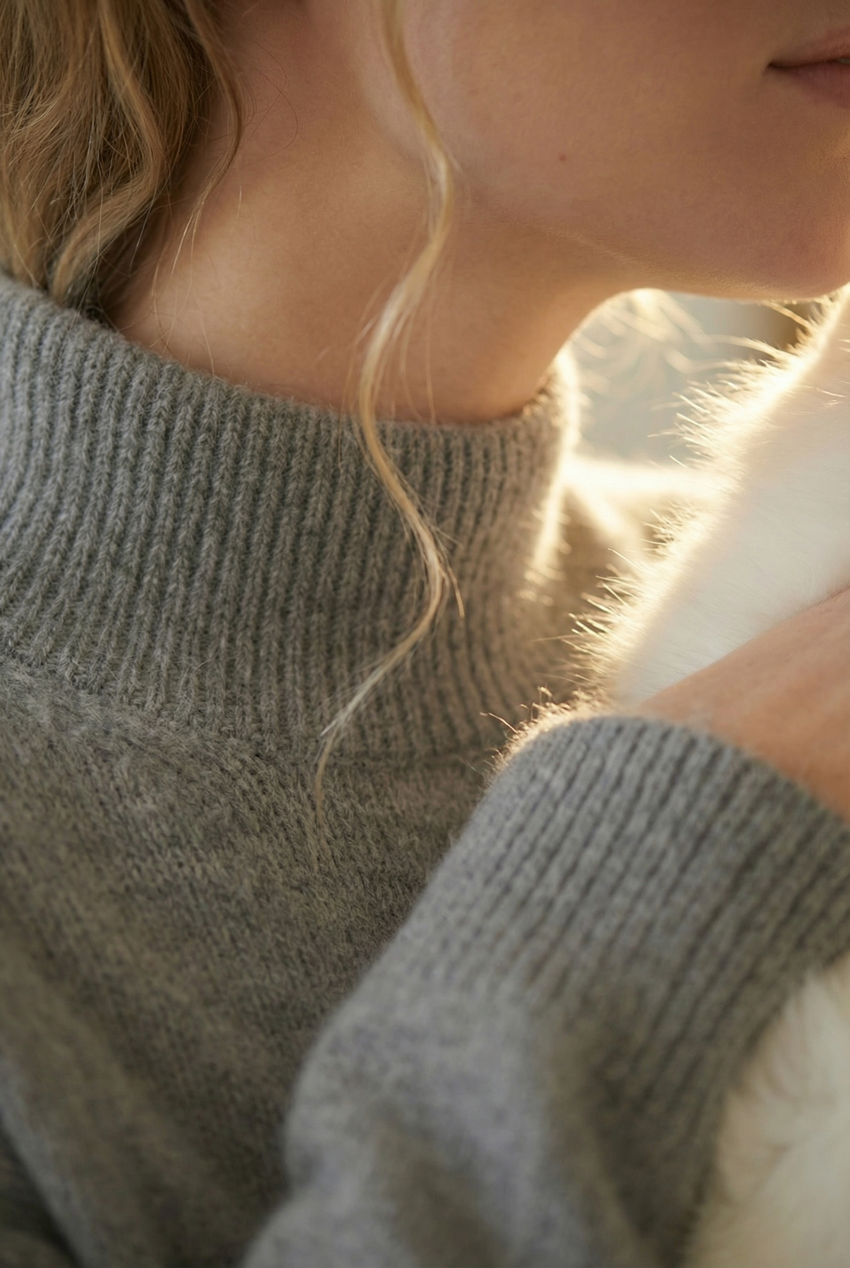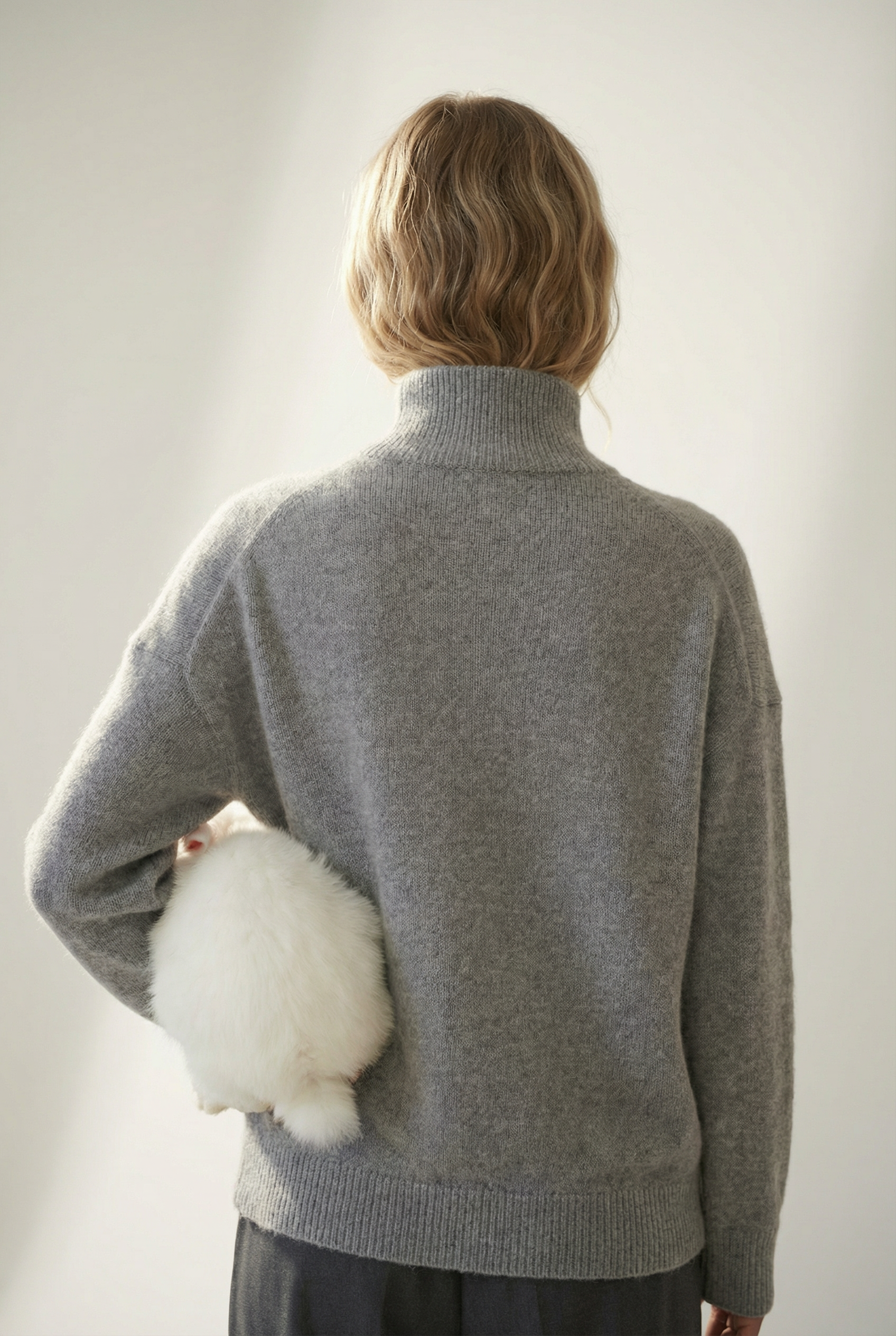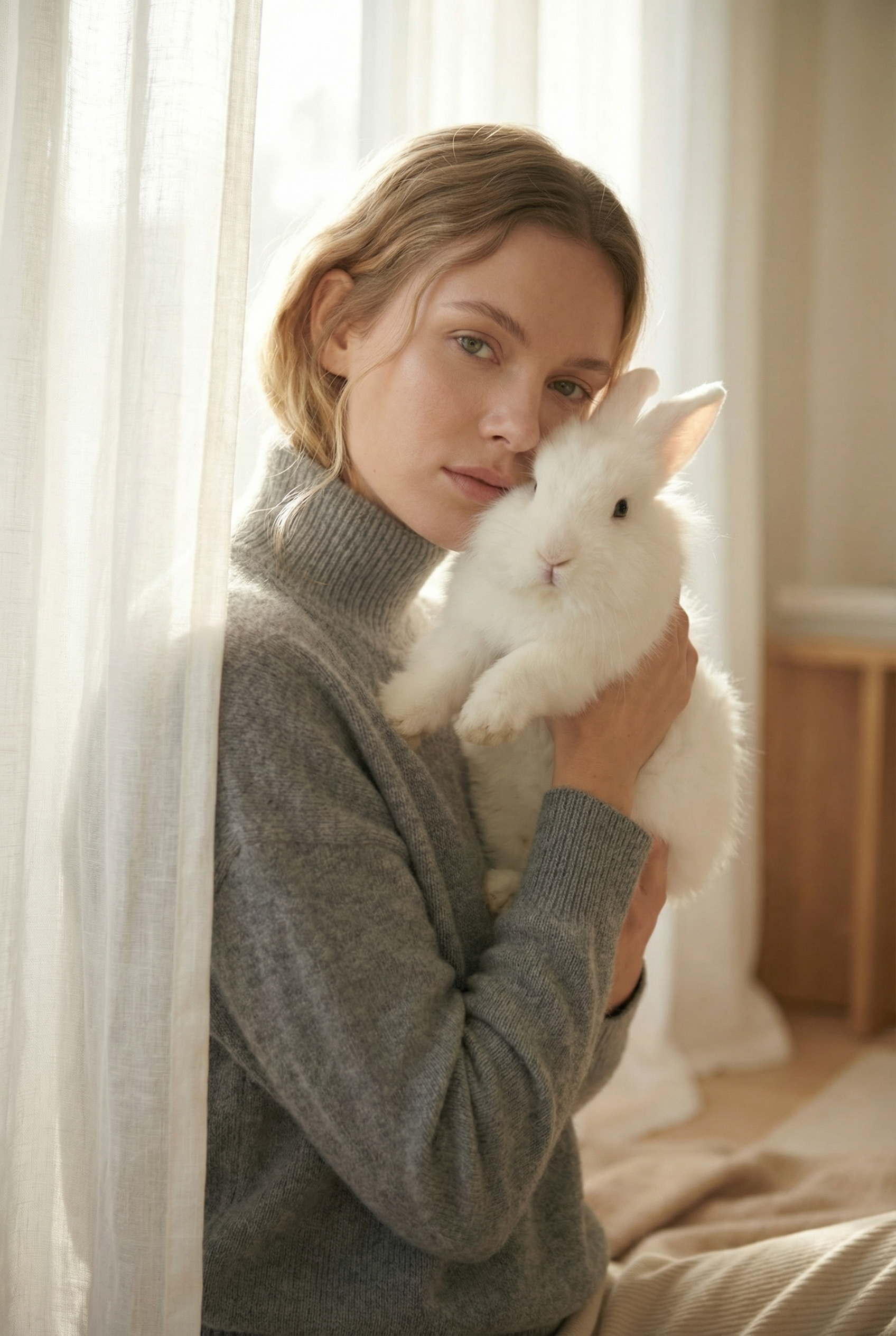 Идея пришла от материала: свитер из ангорской шерсти — значит в кадре должен быть ангорский кролик. Не как реквизит, а как визуальная рифма. Мягкий дневной свет, нейтральный интерьер, никакого лишнего — только серый, белый и тепло.