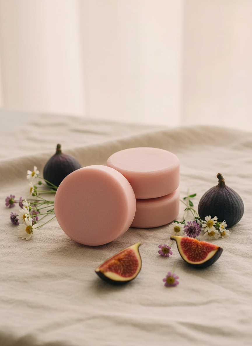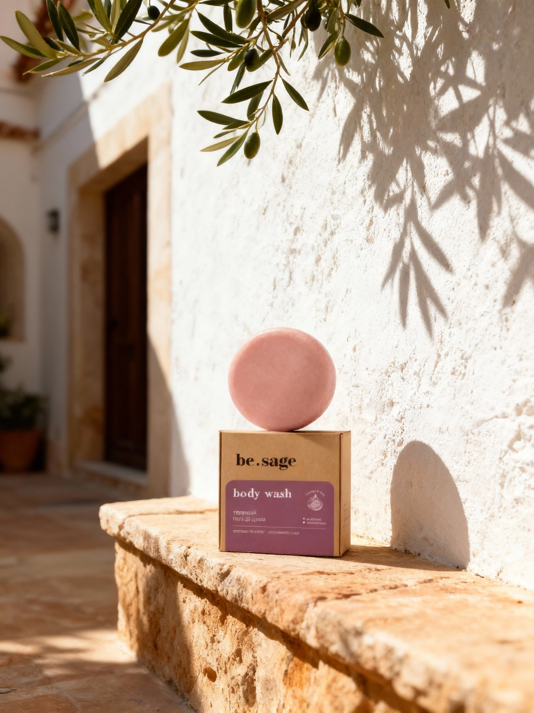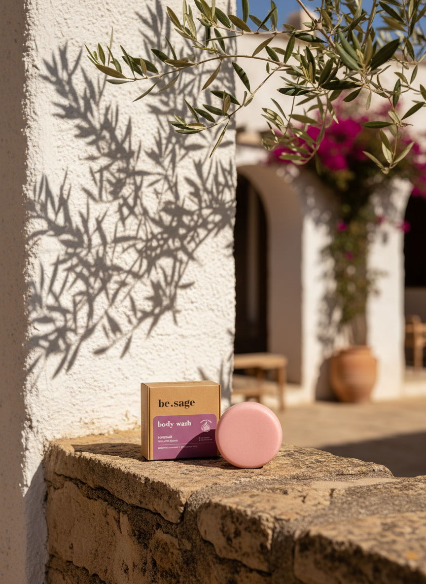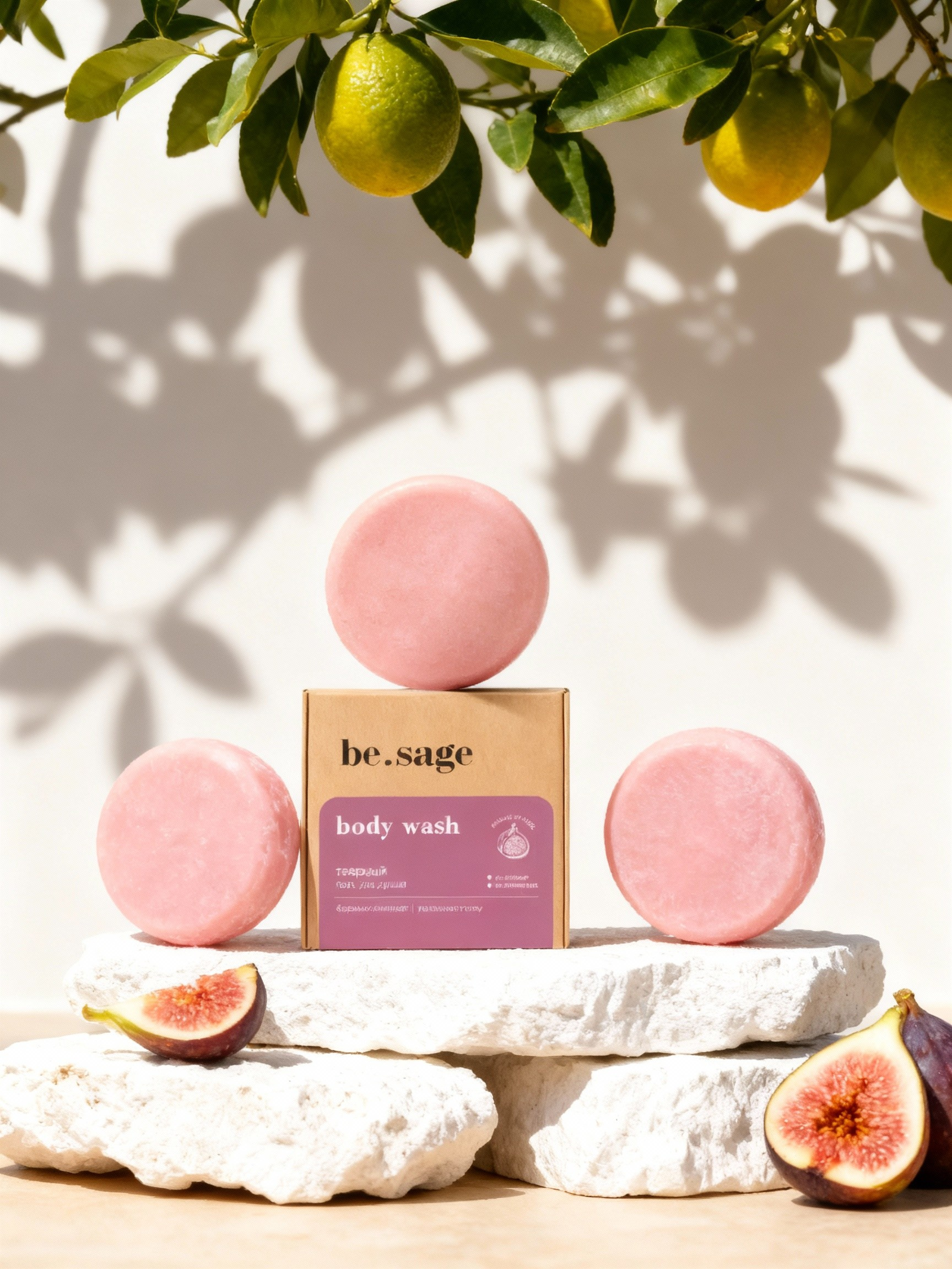 Инициативная предметная съёмка для российского бренда натуральной косметики be.sage — твёрдый гель для душа, средиземноморский дворик, инжир и тени от оливы. Бренд не ответил, кейс остался.