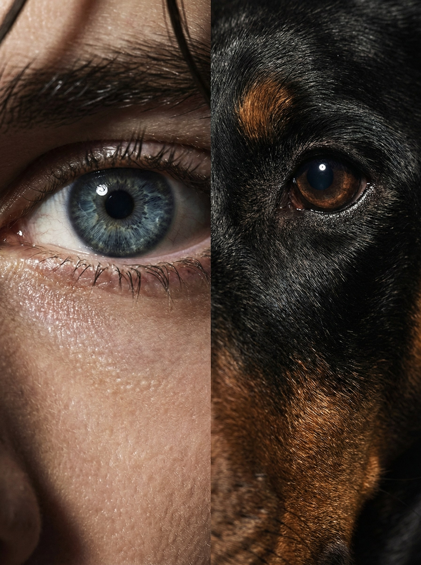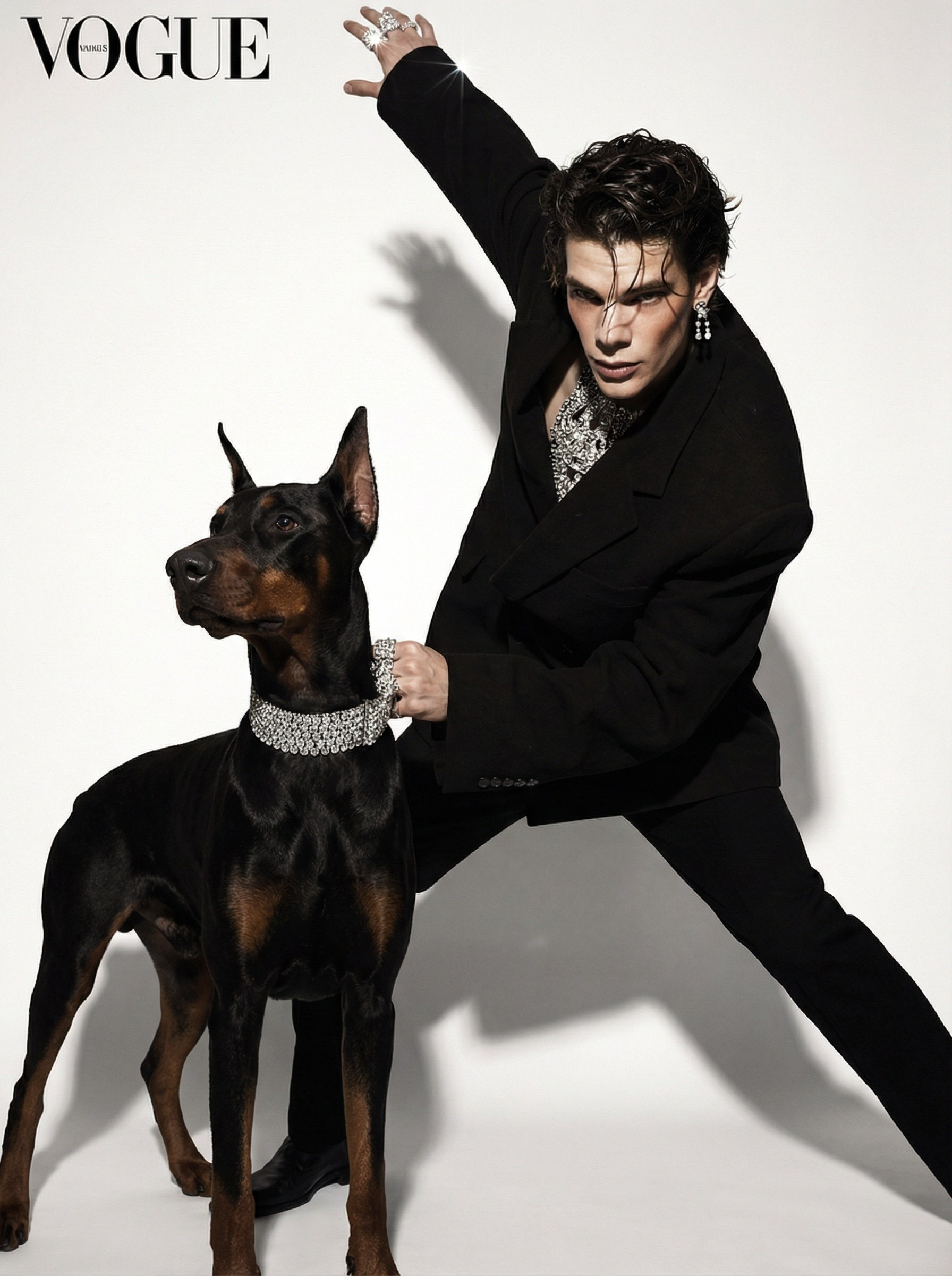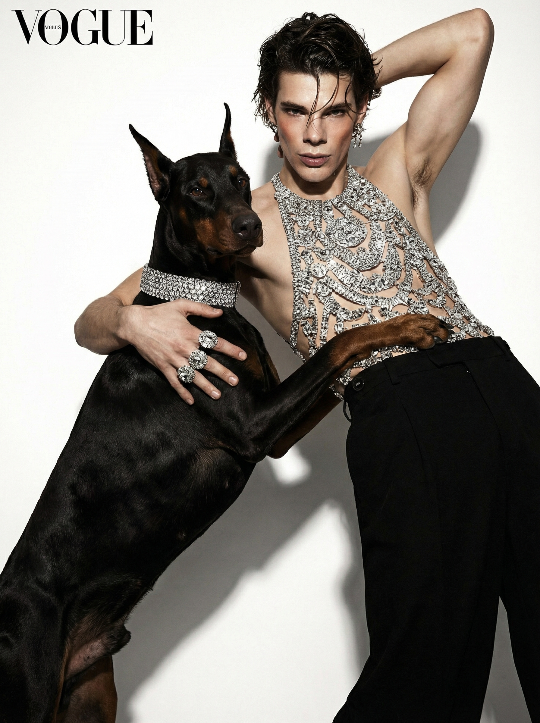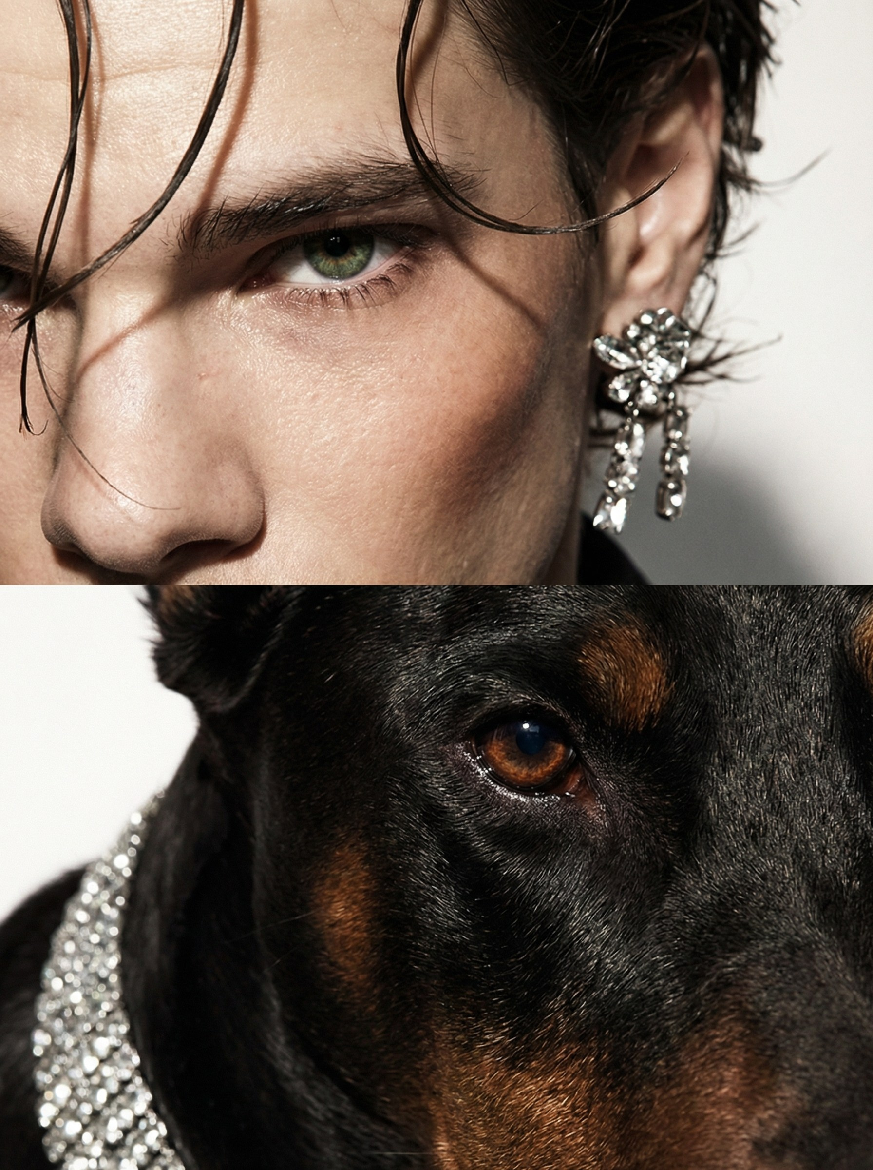 Доберман — порода, которую веками отбирали за агрессию, а потом научили сидеть рядом. Человек в кристаллах — всё то же самое, только наоборот. Кристаллы на обоих не случайно: это про то, как мы упаковываем то, что внутри. Камера фиксирует момент, когда упаковка немного съехала.