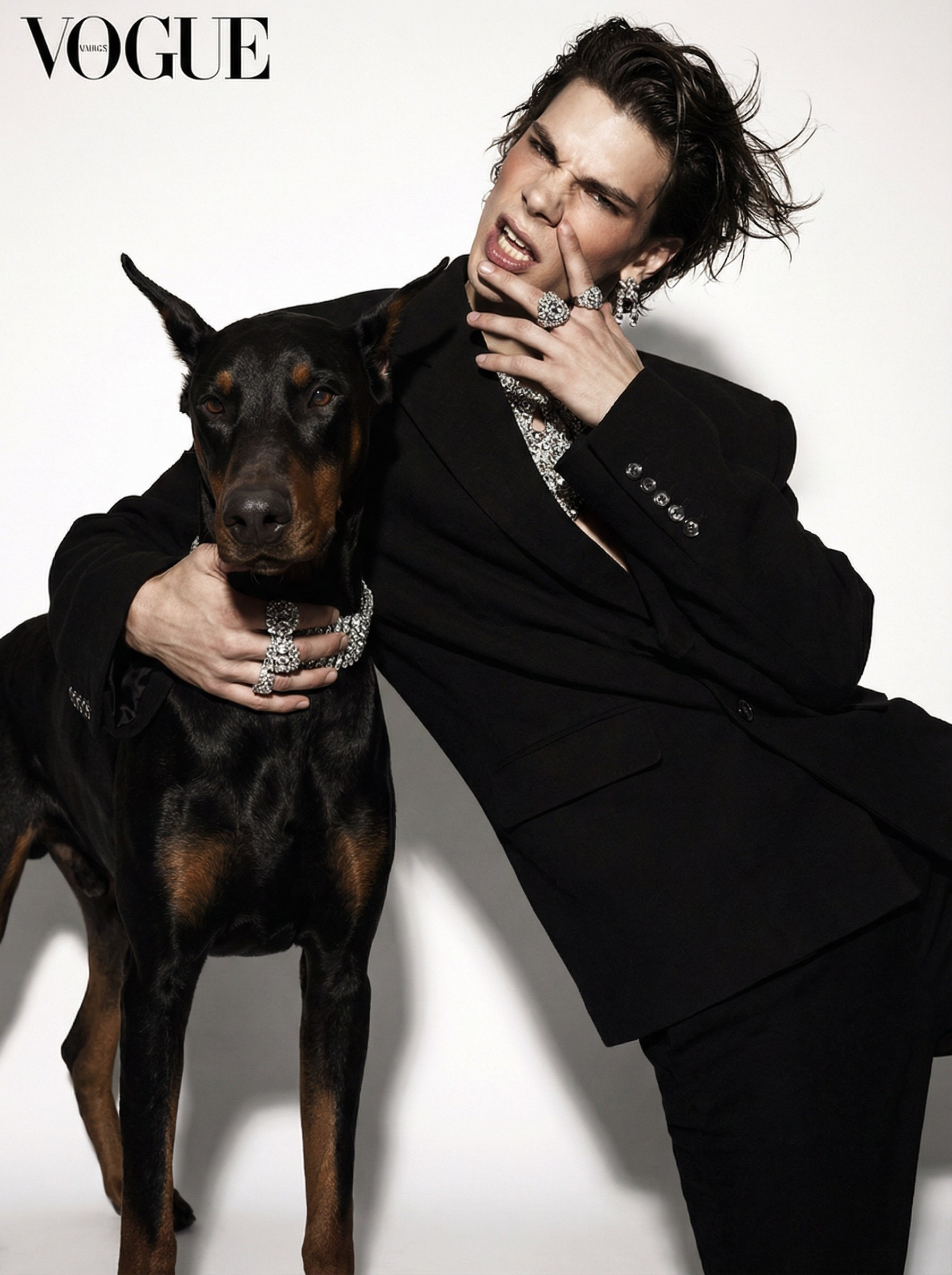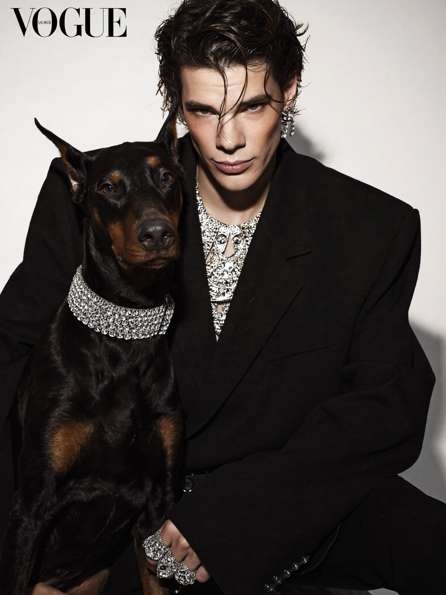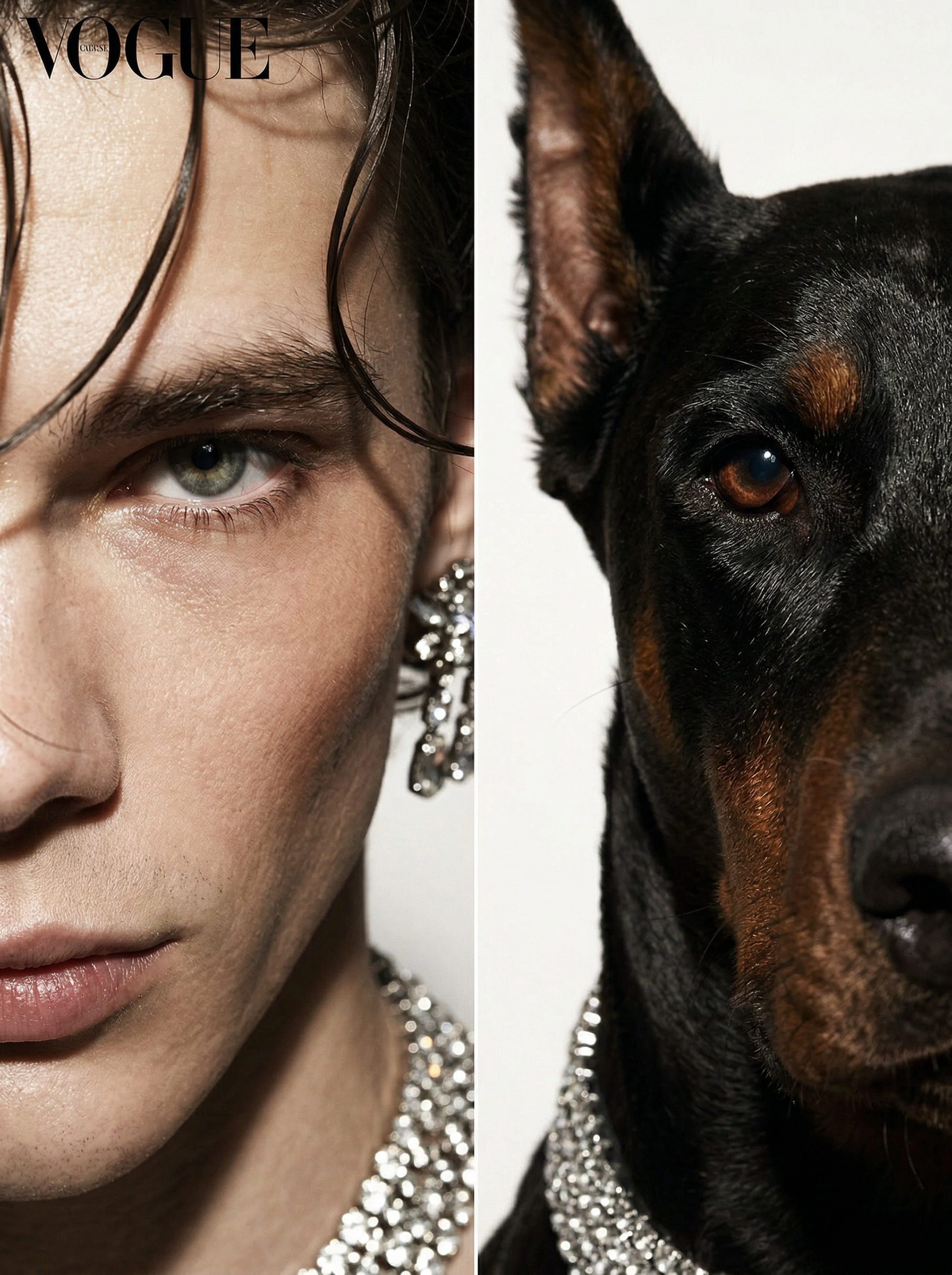 Финальный кадр в формате обложки Vogue. Авторский эдиториал без клиента — чистый эксперимент с образом и парным портретом.