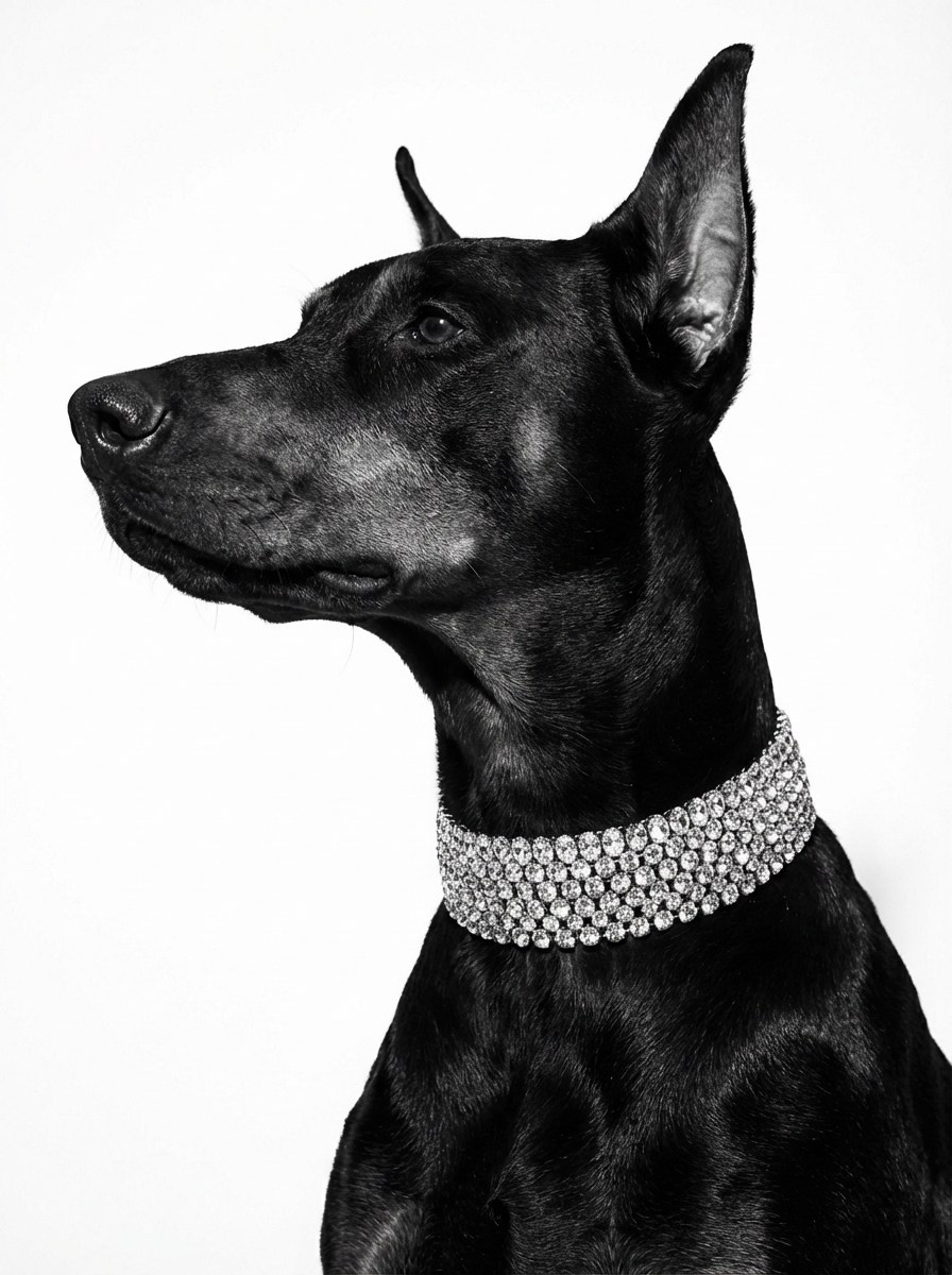 Цветовая палитра: глубокий чёрный, холодное серебро, тёплый подтон кожи добермана.