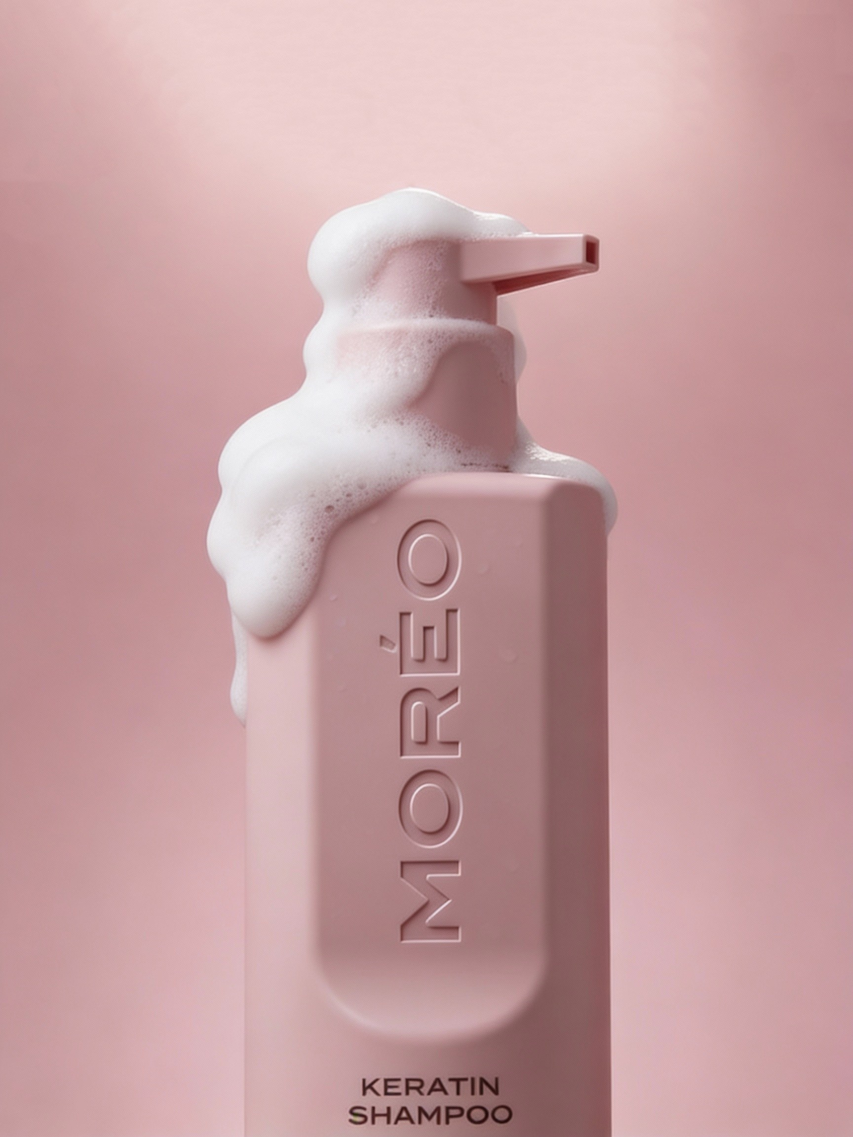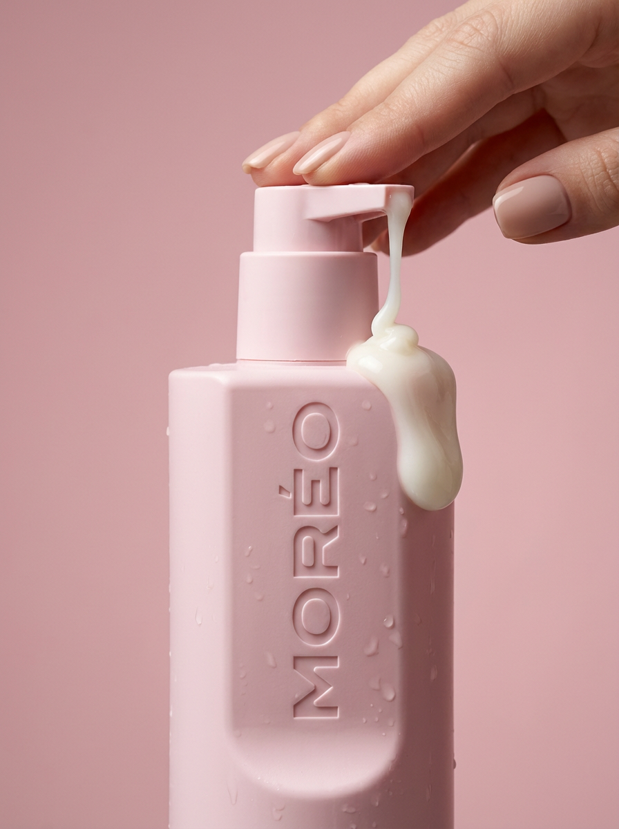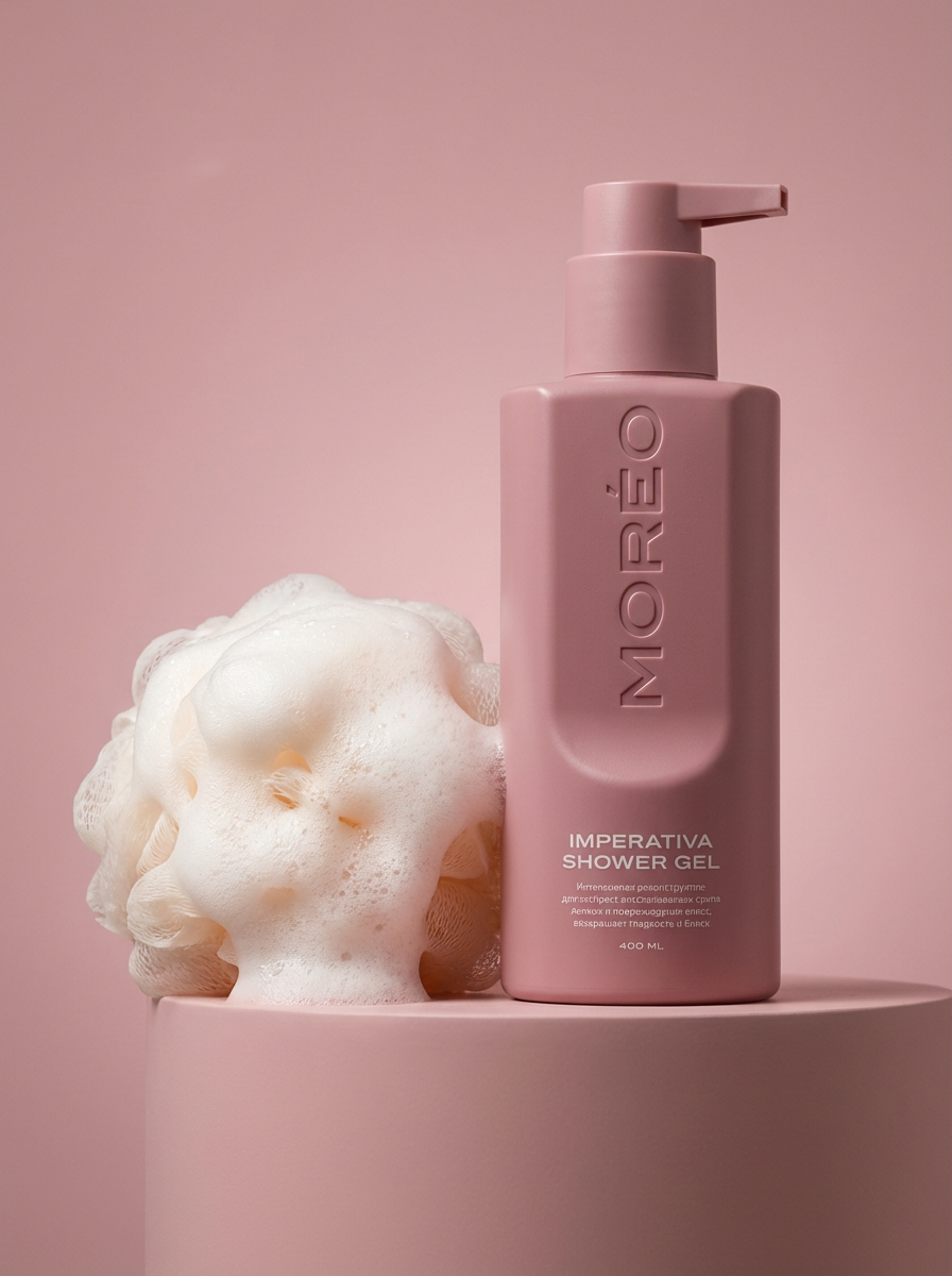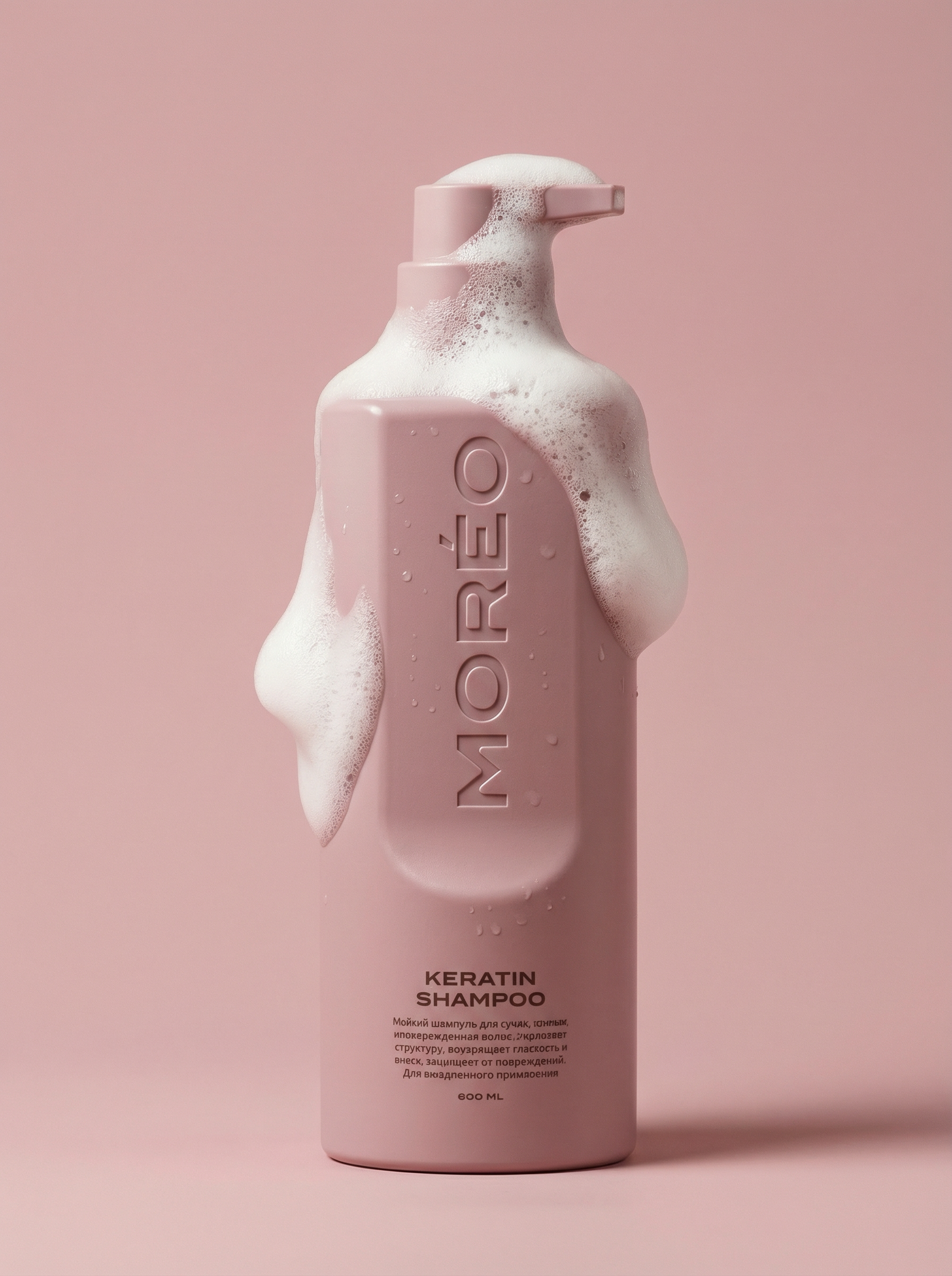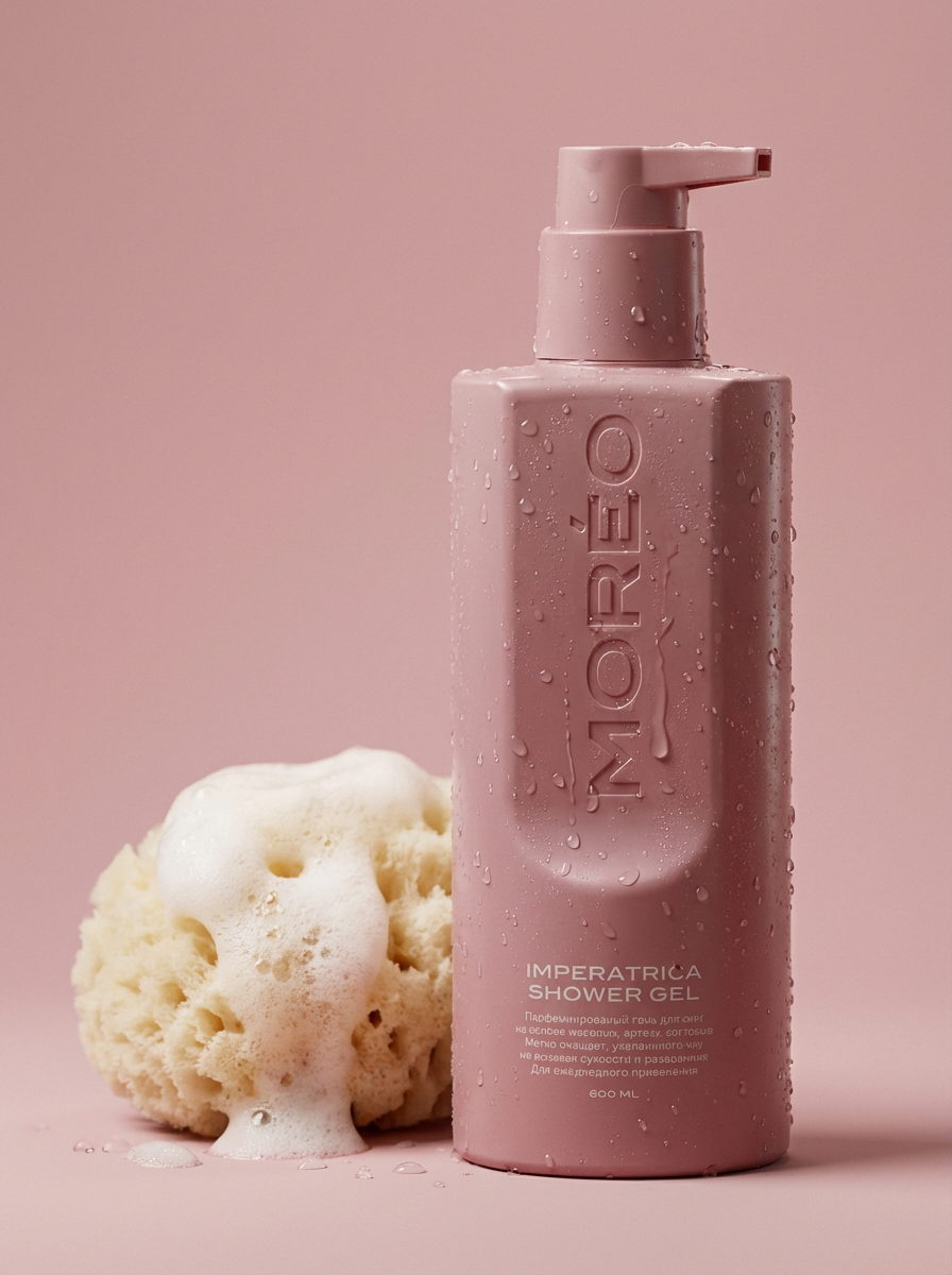 Из одной карточки товара с четырьмя флаконами в ряд — полноценная beauty-кампания. Пена, текстуры, модель, атмосфера. Всё создано с нуля на основе единственного исходника.