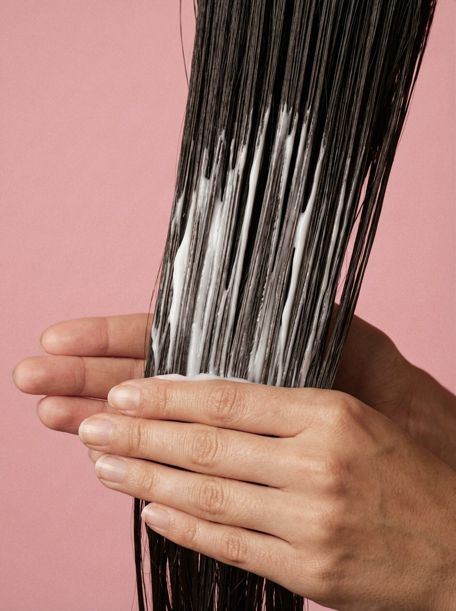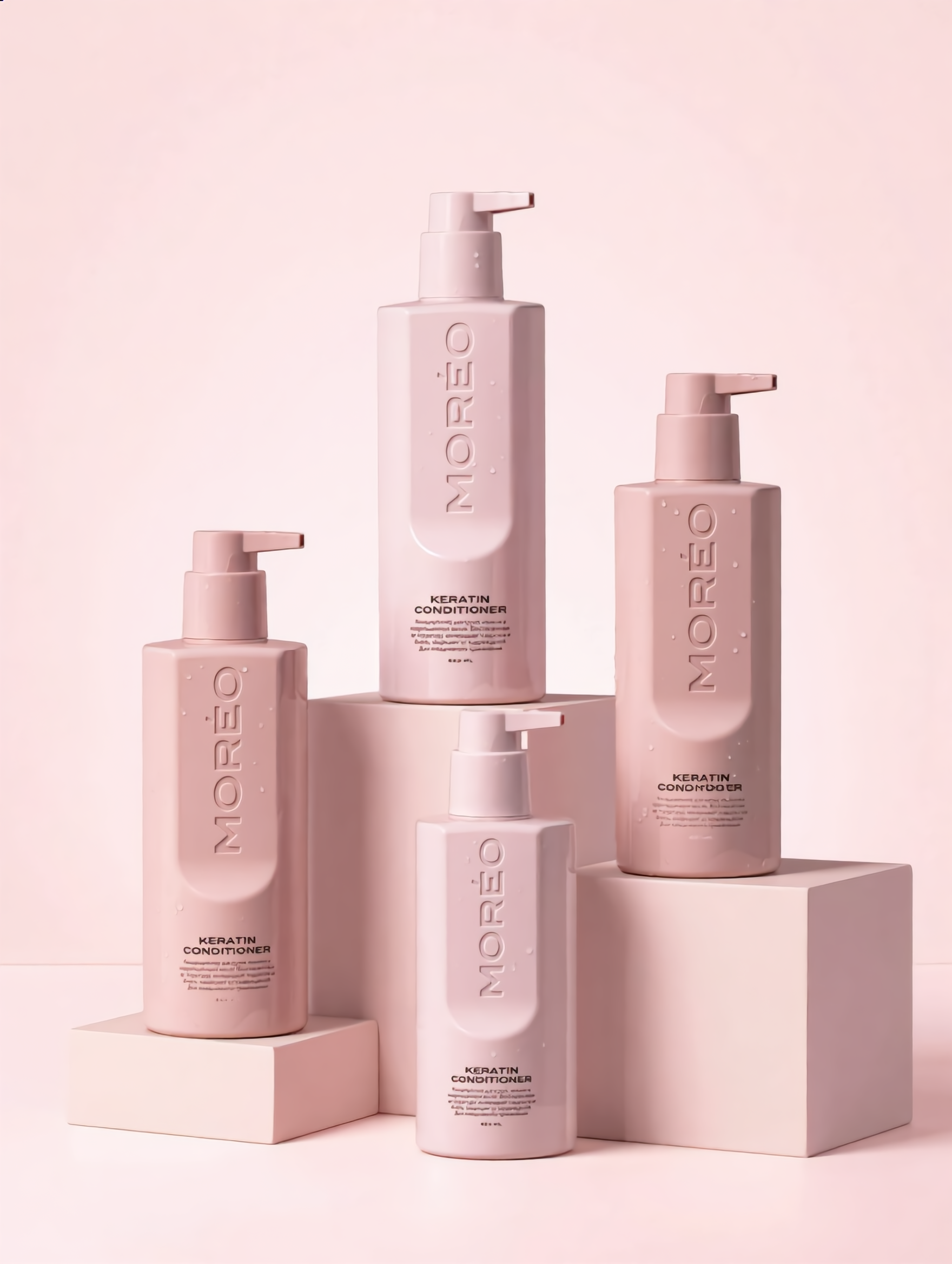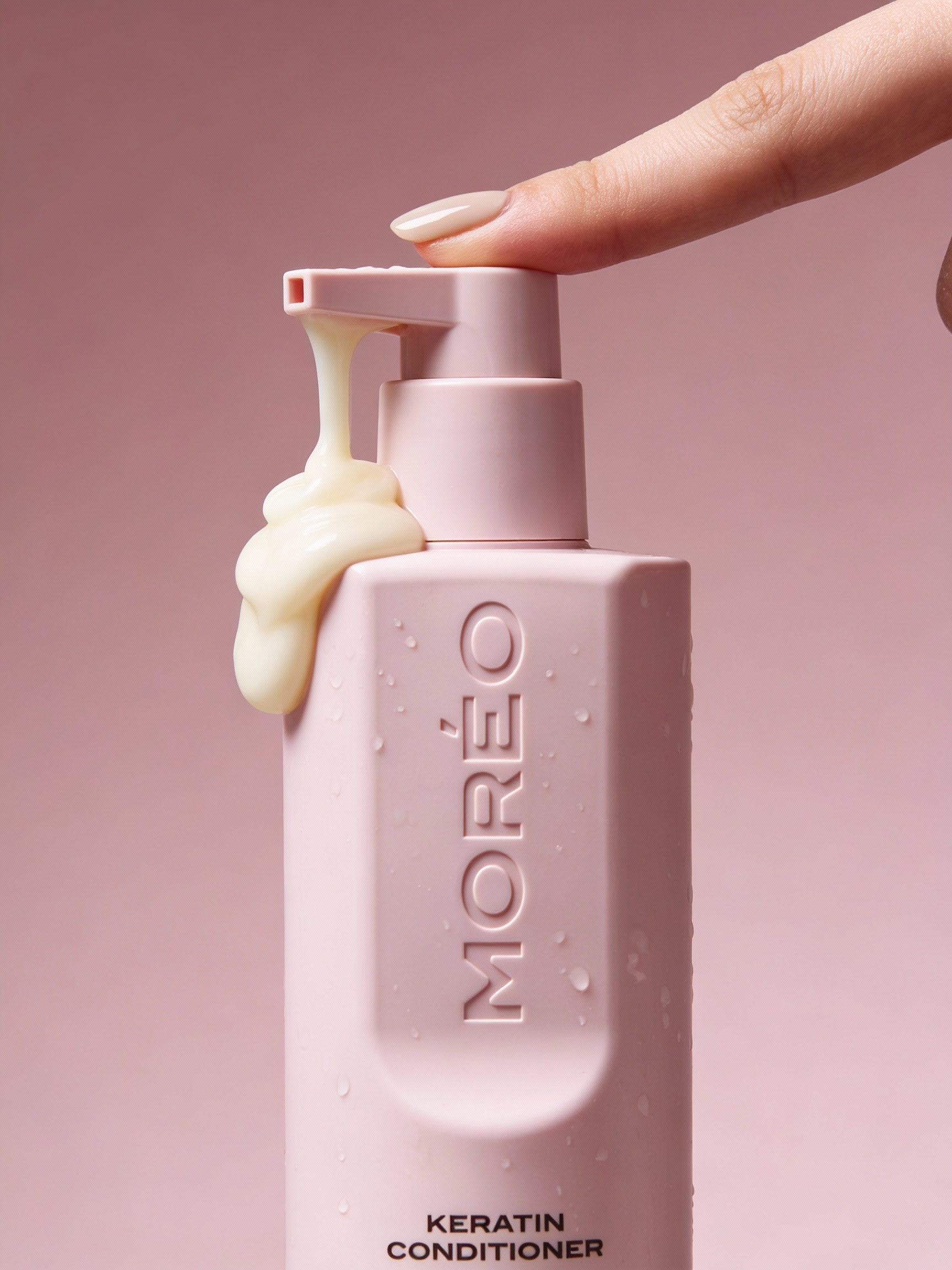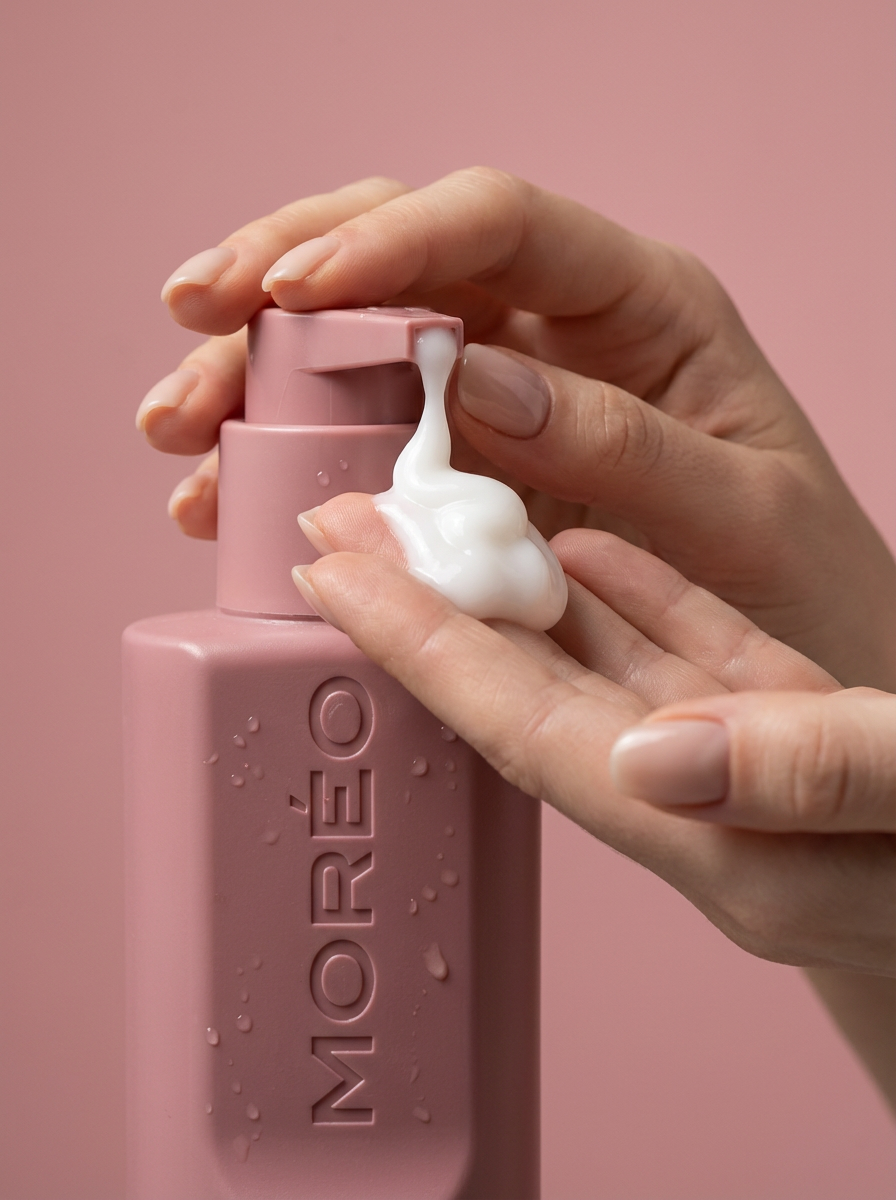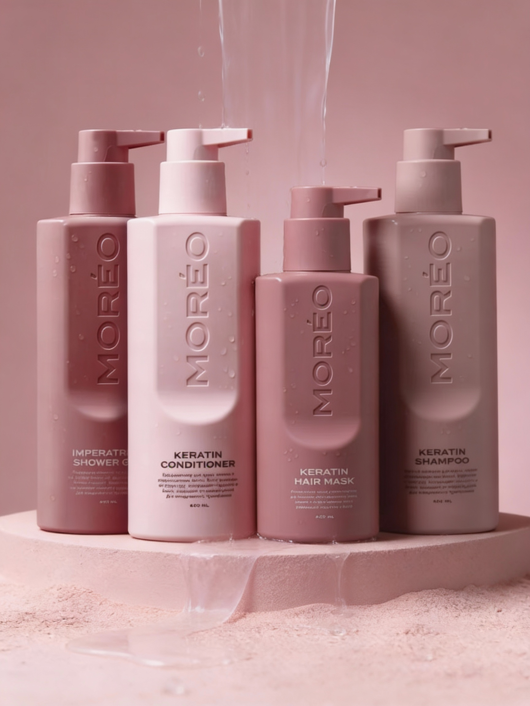 Из одной карточки товара с четырьмя флаконами в ряд — полноценная beauty-кампания. Пена, текстуры, модель, атмосфера. Всё создано с нуля на основе единственного исходника.