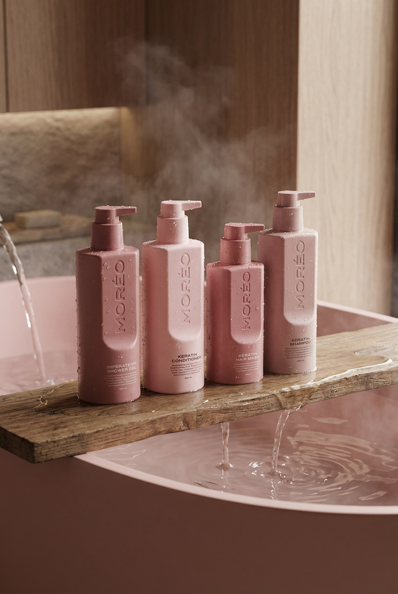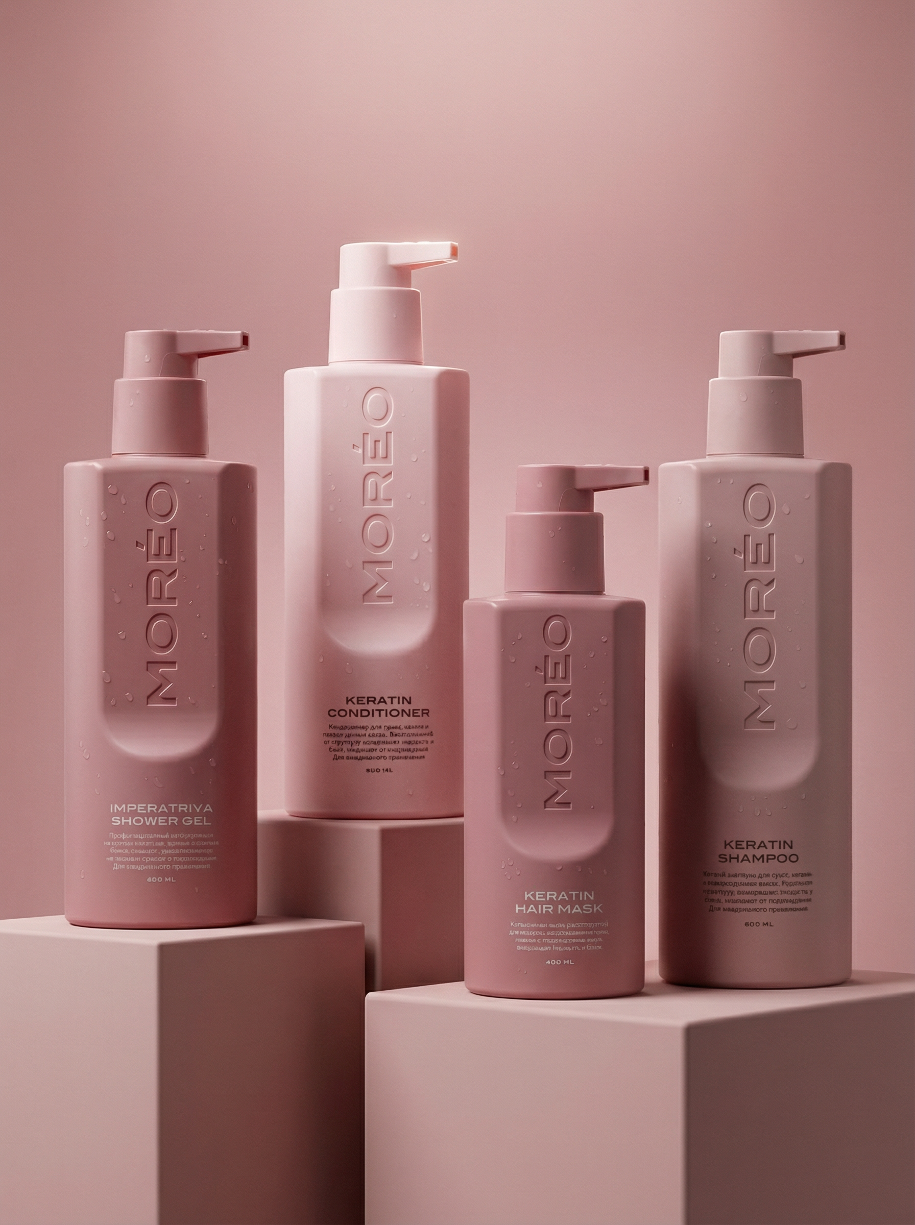 Исходник — базовая карточка маркетплейса: четыре флакона, белый фон, никакого настроения. Задача — показать что может быть, если дать продукту правильный визуальный язык. Розовая палитра бренда стала отправной точкой: пена, влажные волосы, тактильные текстуры, пар — всё работает на ощущение ритуала, заботы и удовольствия от продукта.
