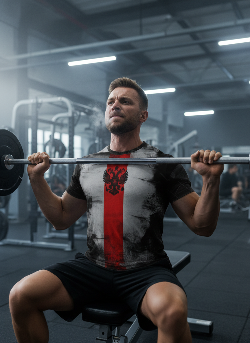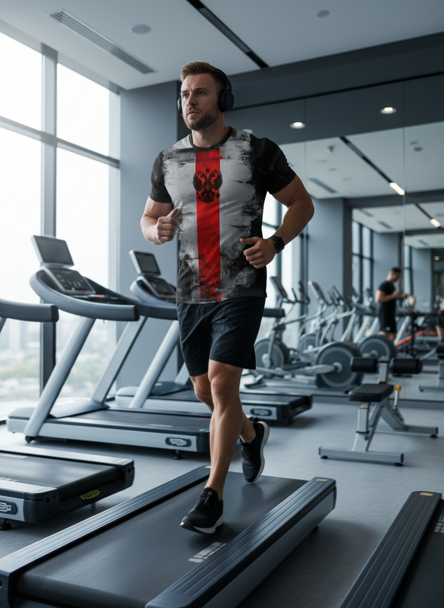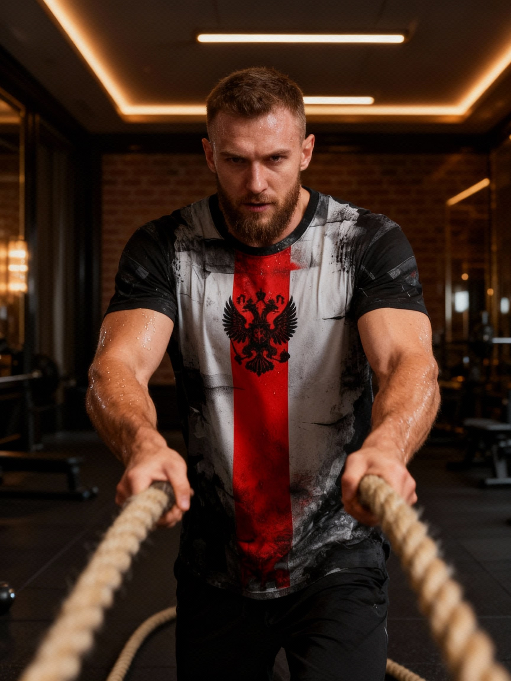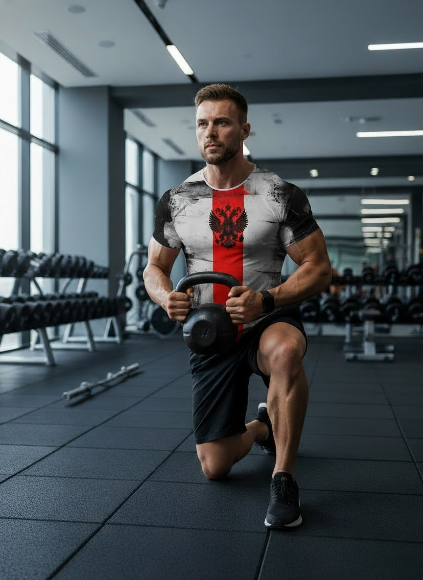 Мужская спортивная одежда с брутальной эстетикой — двуглавый орёл, тёмный мрамор, агрессивный графический принт. Gym-кампания строилась вокруг физической энергии: движение, напряжение тела, контрастный свет спортзала. Одежда должна была выглядеть как на реальной съёмке — до того как её сшили.