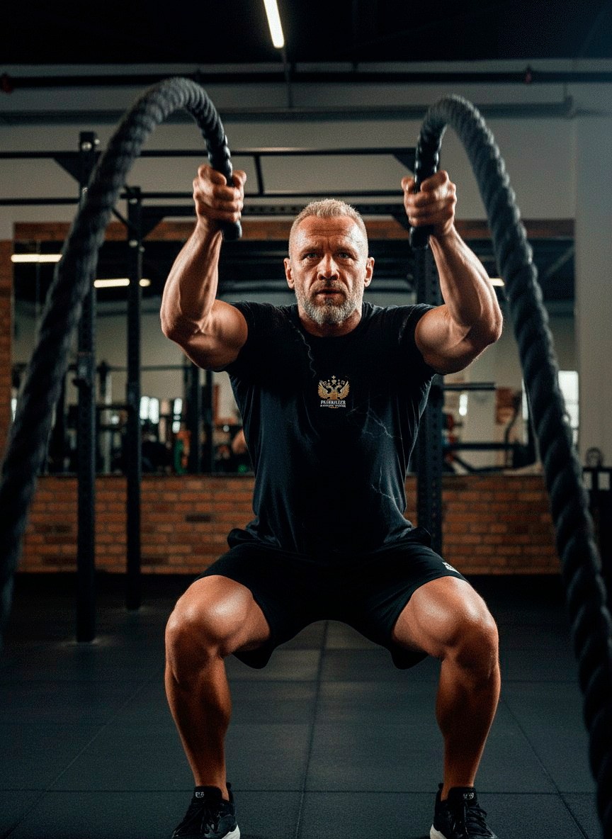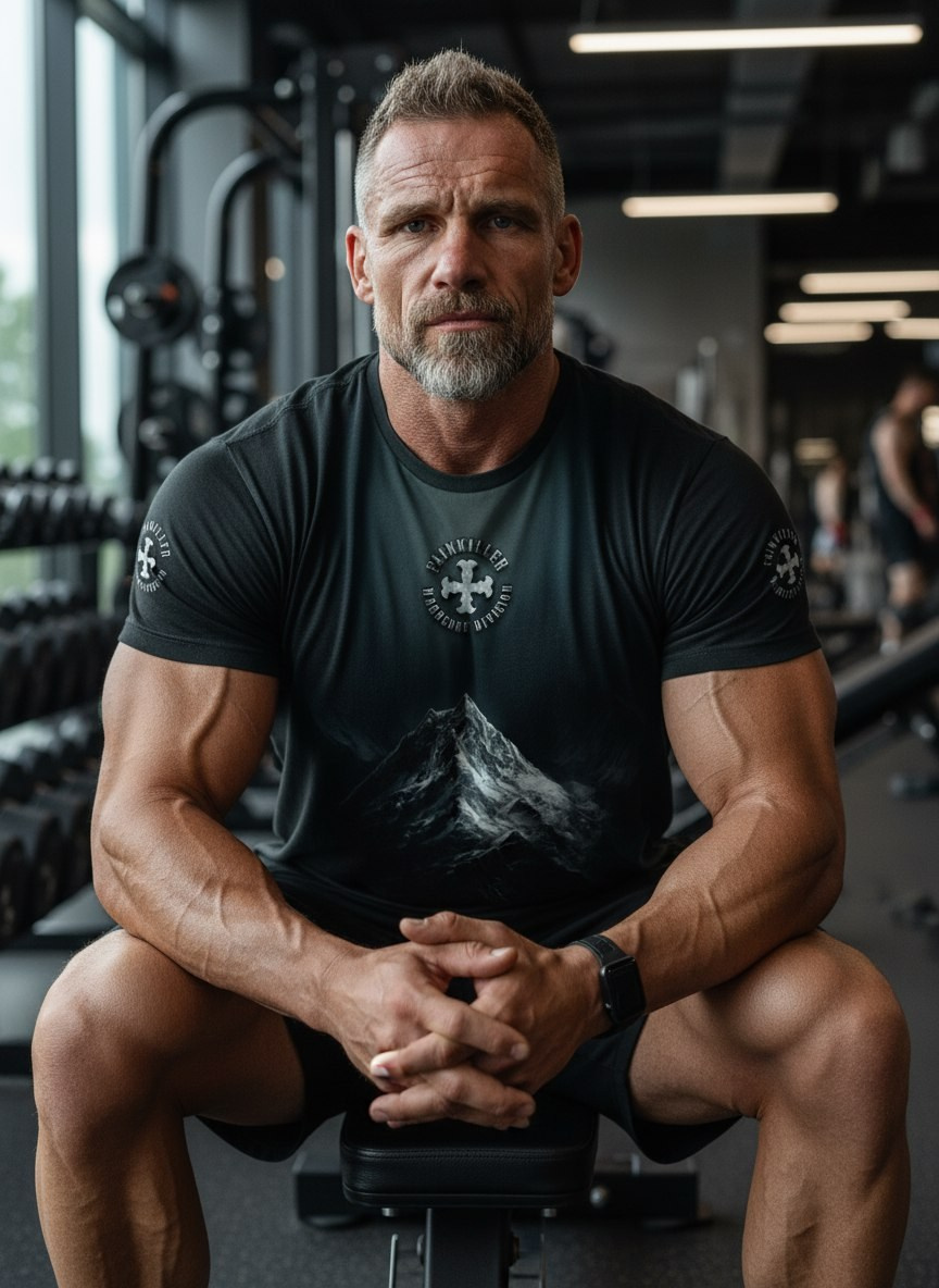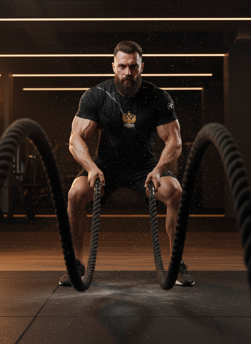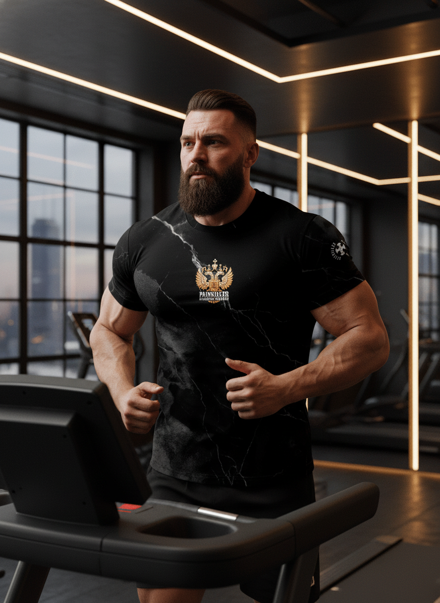Мужская спортивная одежда с брутальной эстетикой — двуглавый орёл, тёмный мрамор, агрессивный графический принт. Gym-кампания строилась вокруг физической энергии: движение, напряжение тела, контрастный свет спортзала. Одежда должна была выглядеть как на реальной съёмке — до того как её сшили.