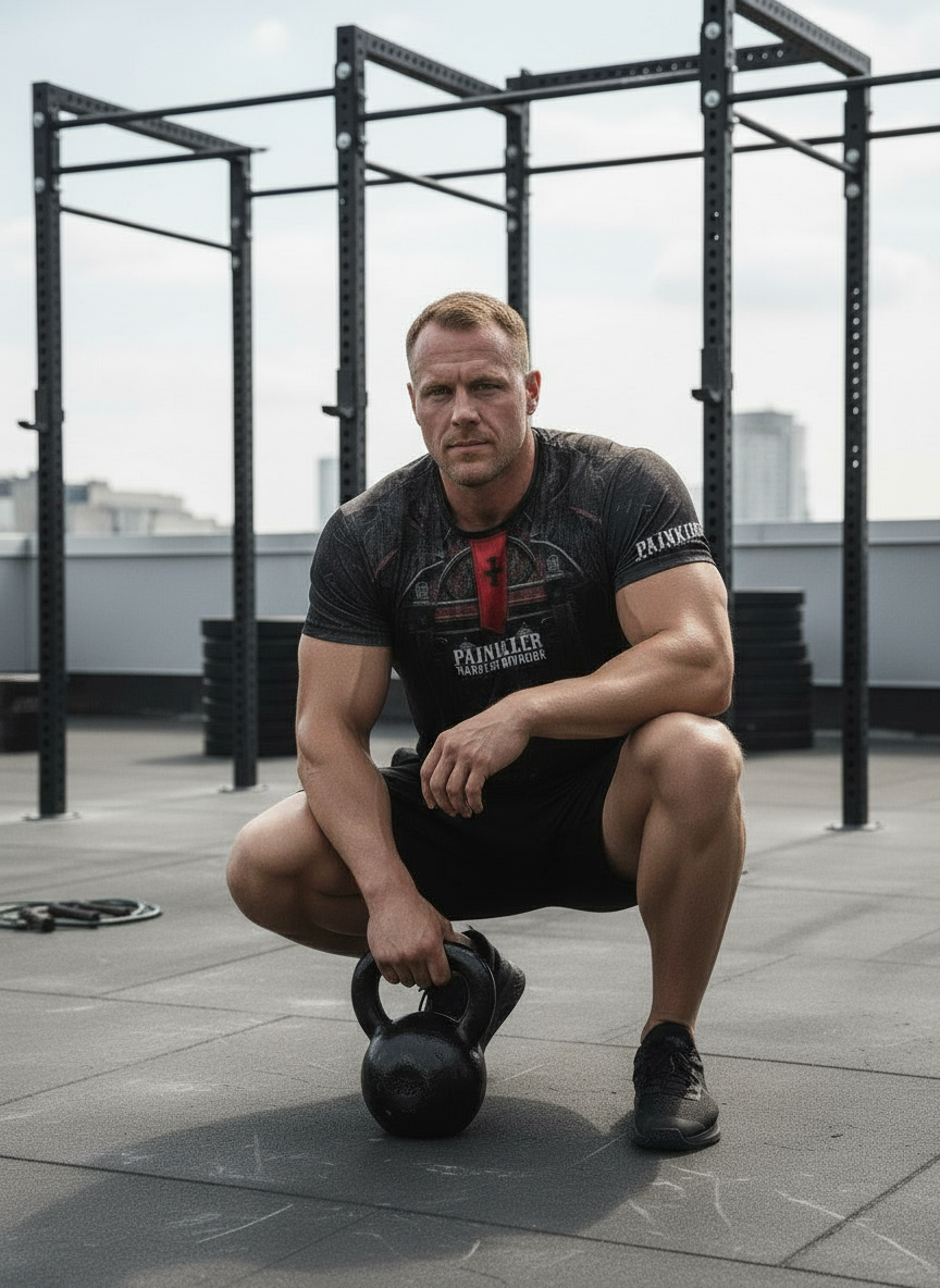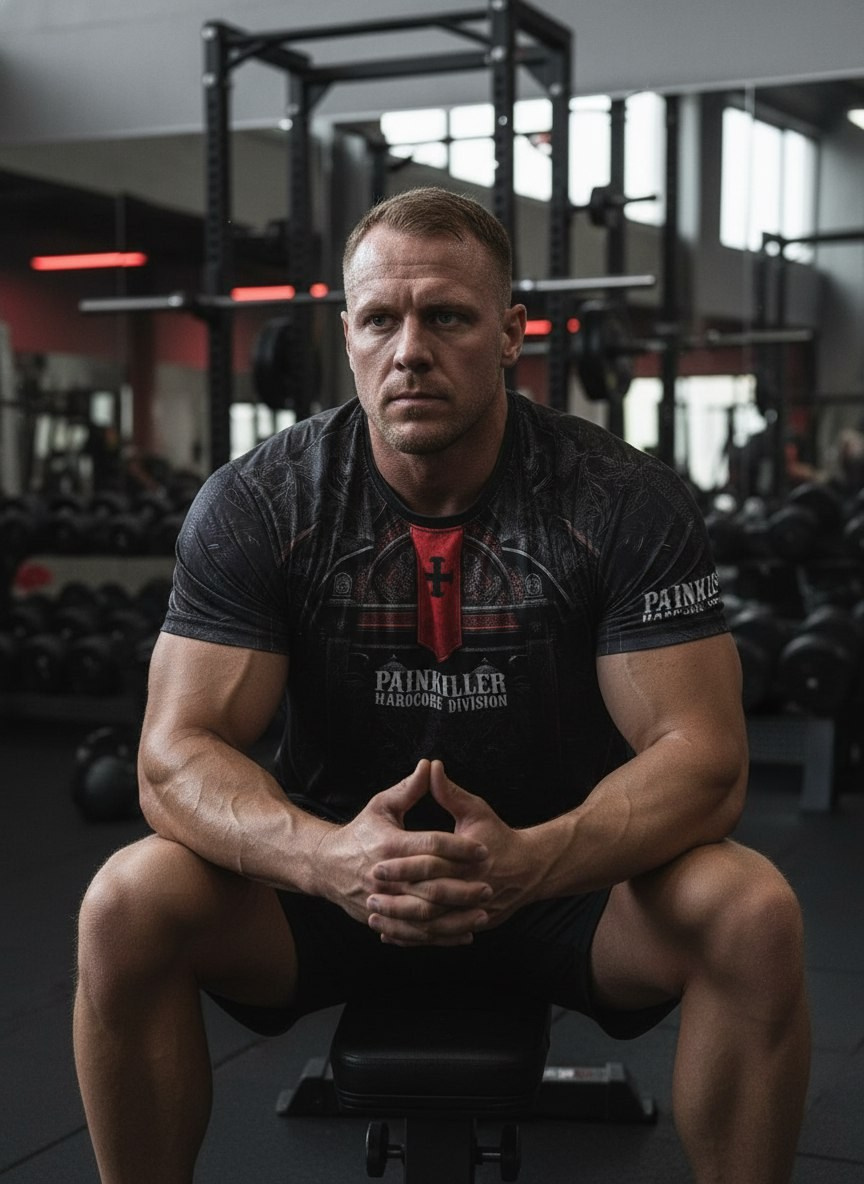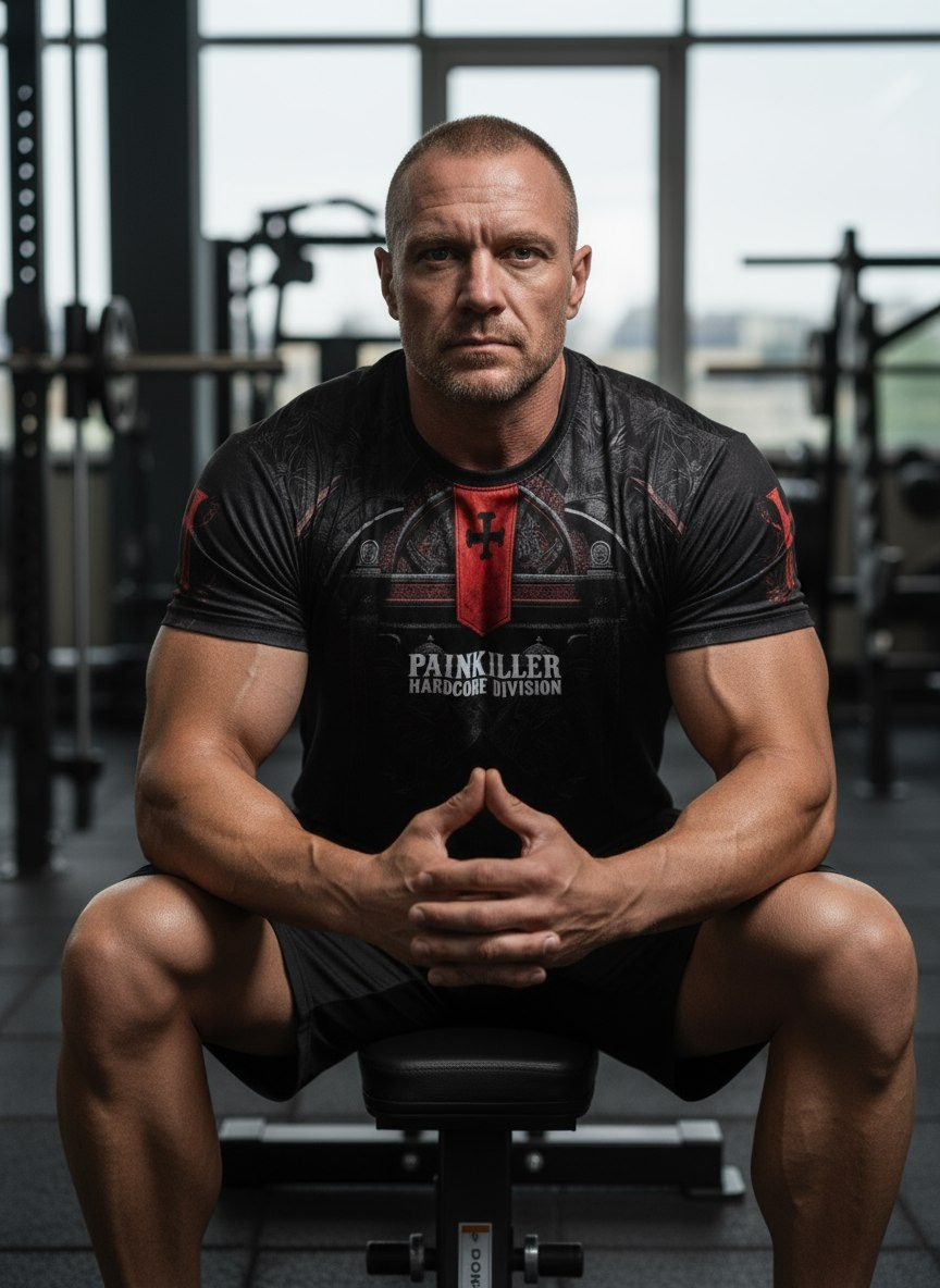 Коммерческая gym-кампания для мужского спортивного бренда Painkiller — визуализация продукта, которого ещё не существовало. Только PDF-макеты, технические материалы и задача сделать так, чтобы одежда выглядела уже реальной.