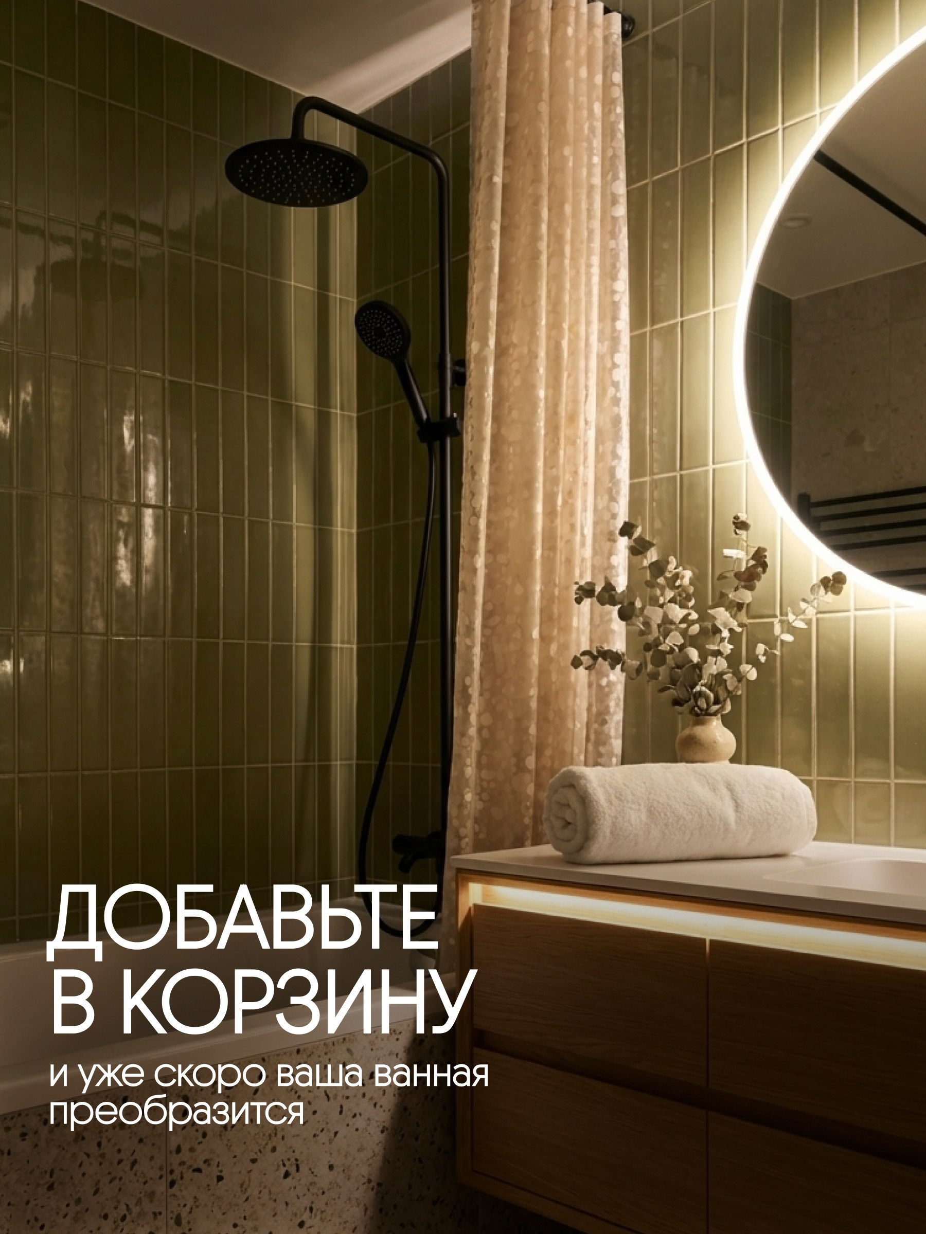 Заказчик прислал папку с изображениями шторки для ванной, снятой у него дома и попросил собрать минималистичную карусель карточек с генерациями и инфографикой.