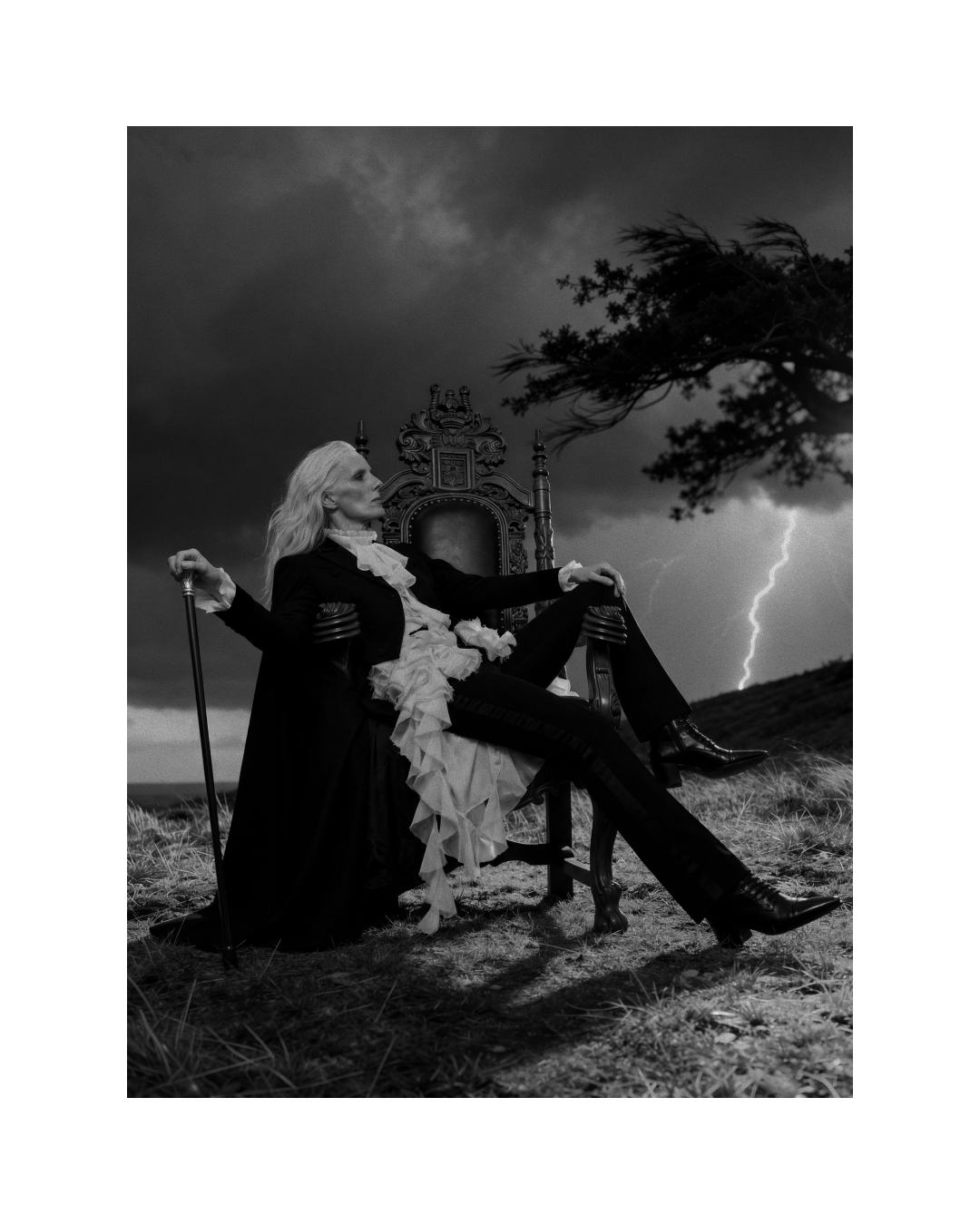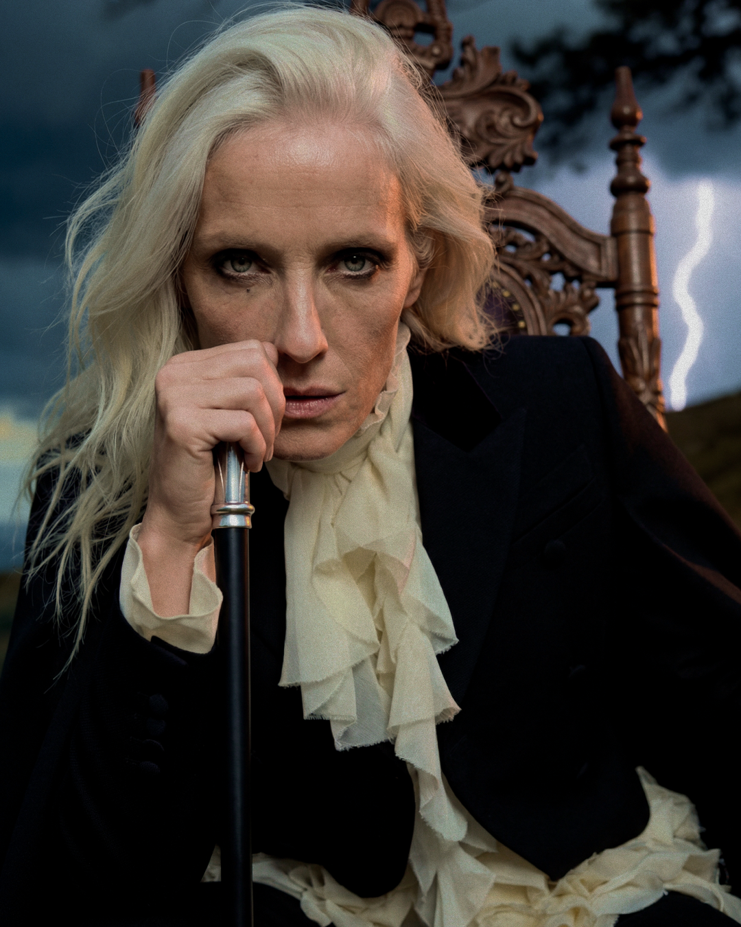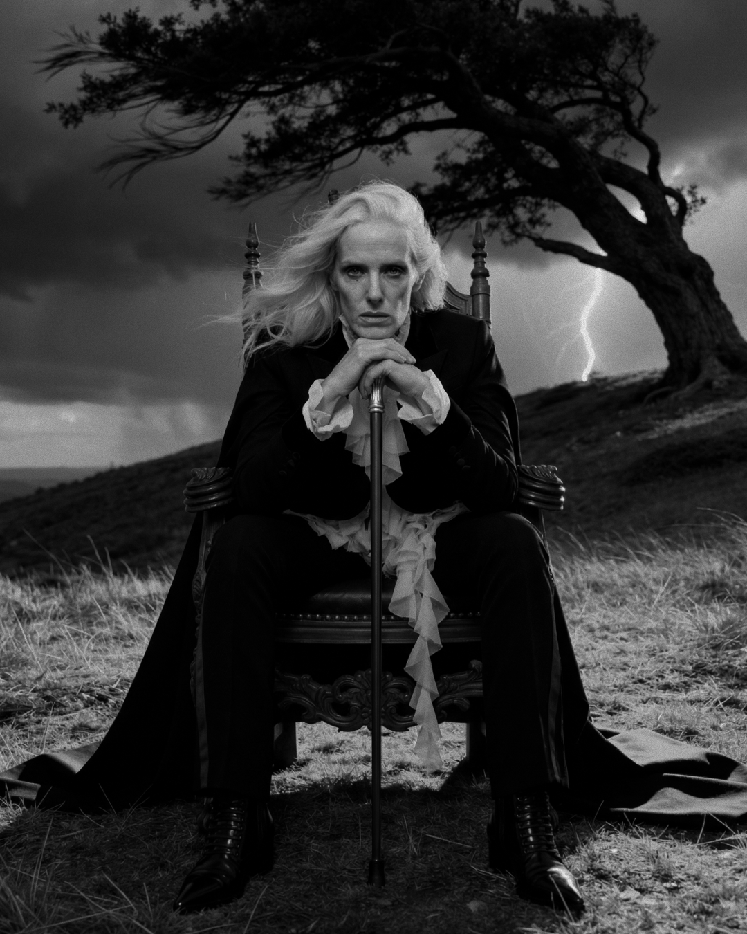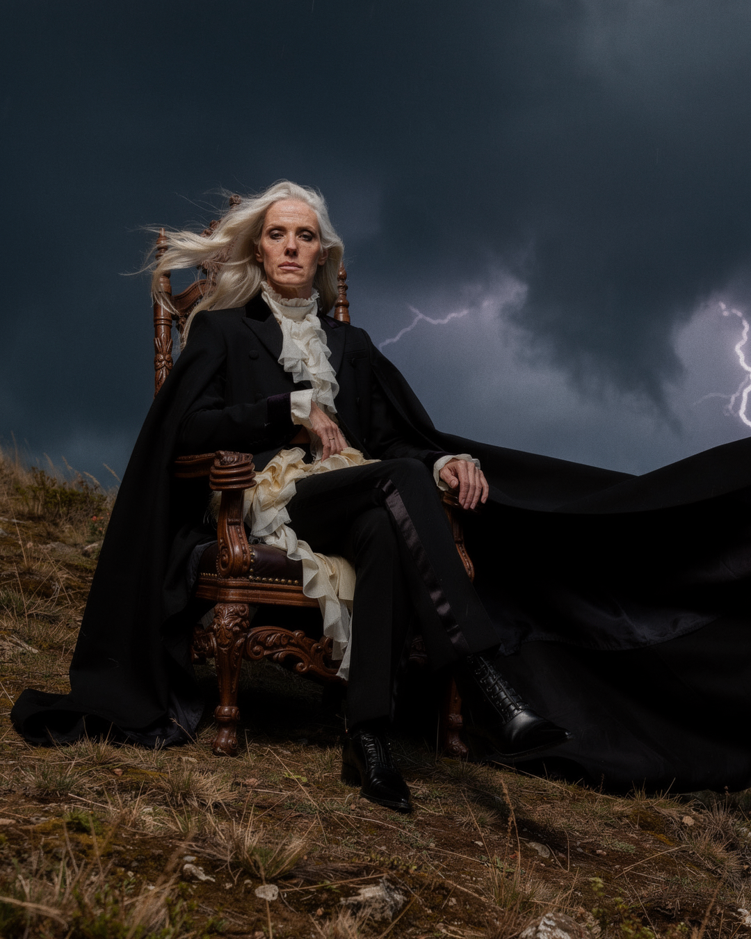 Идея пришла от образа McQueen осень-зима 2025 — чёрный кейп с каскадным жабо. Захотелось поместить его не на подиум, а в стихию. Женщина в кресле посреди грозового поля — не жертва бури, а её хозяйка. Платиновые волосы, трость, молния на фоне. Никакого бегства.