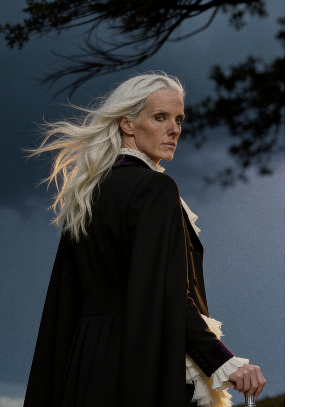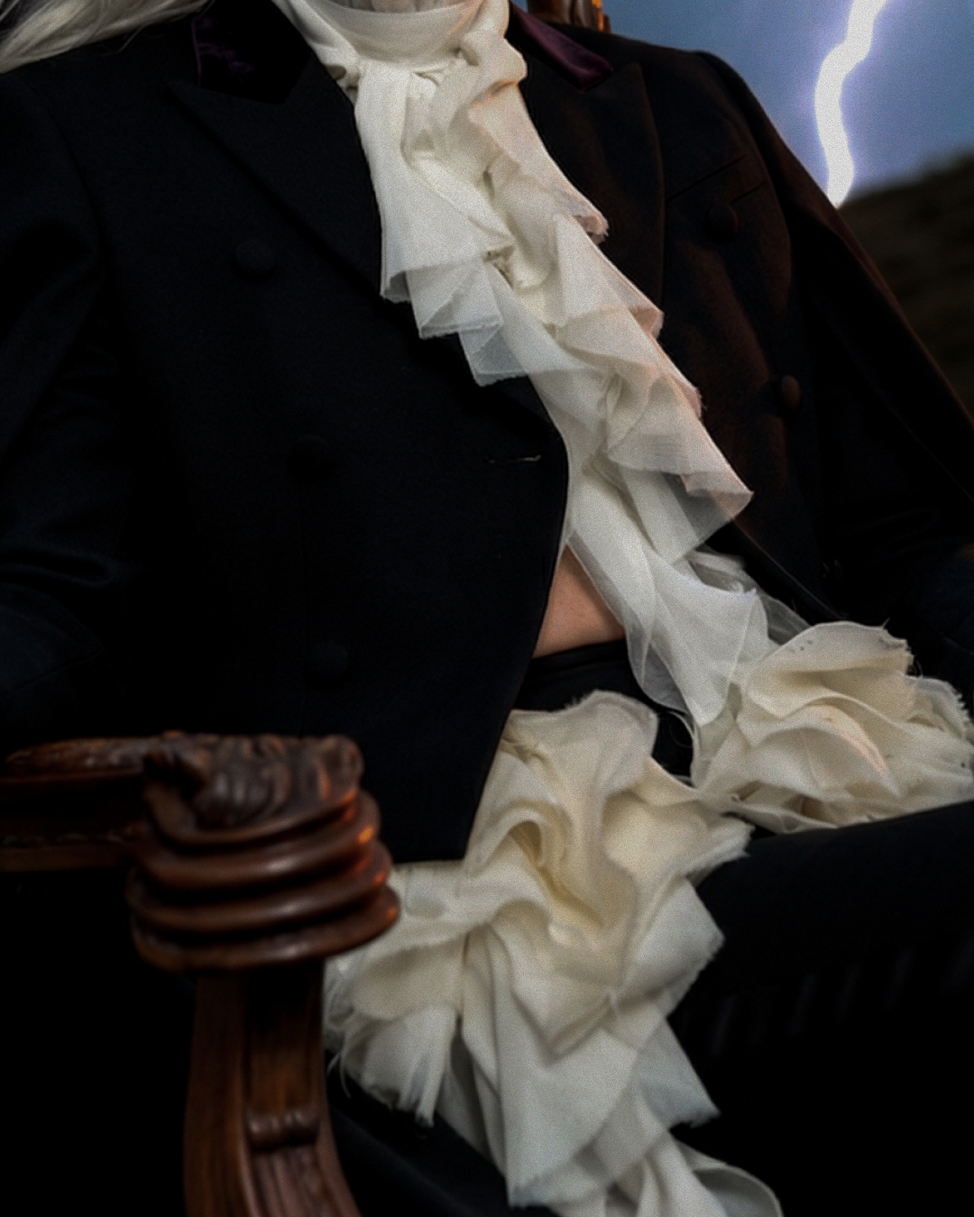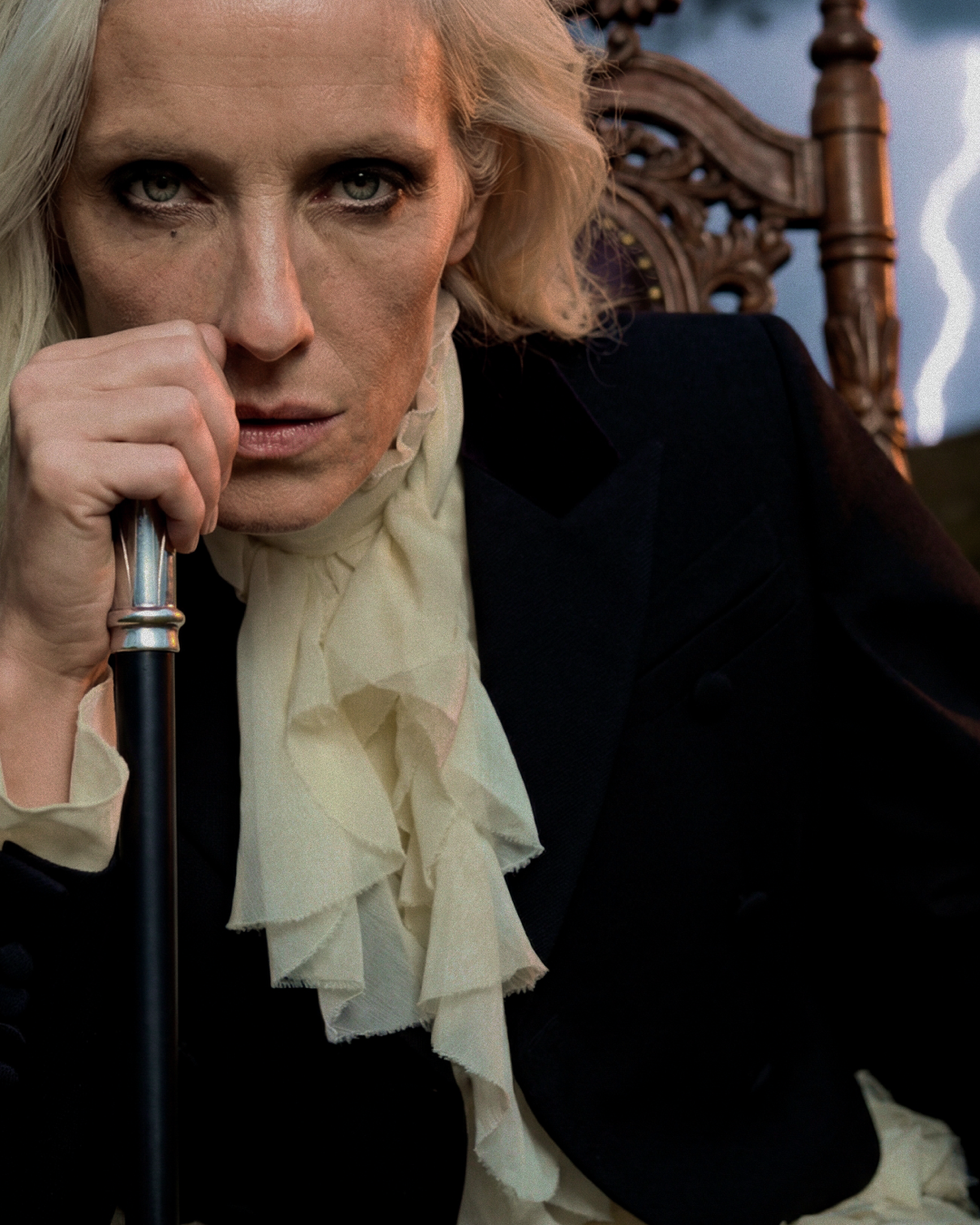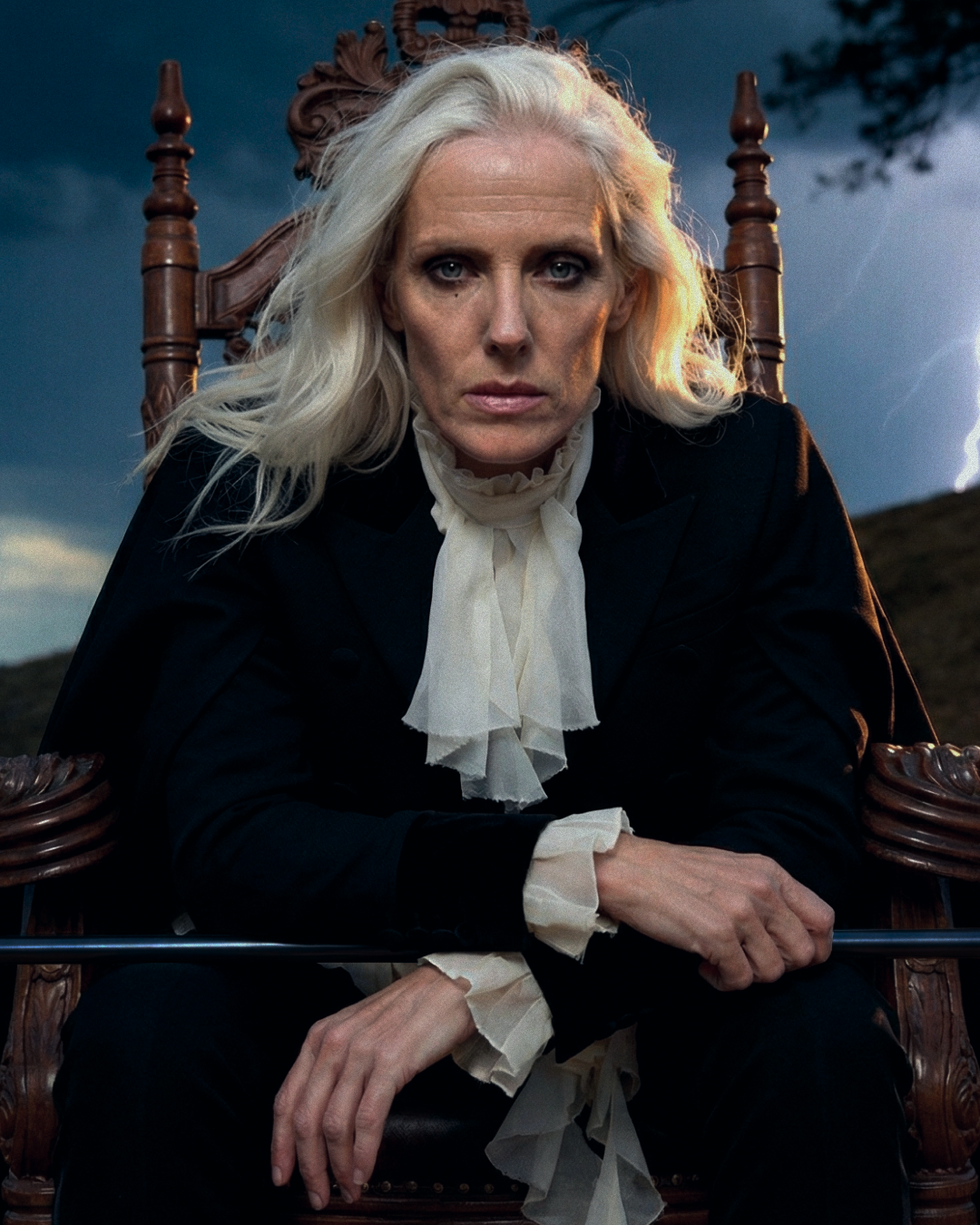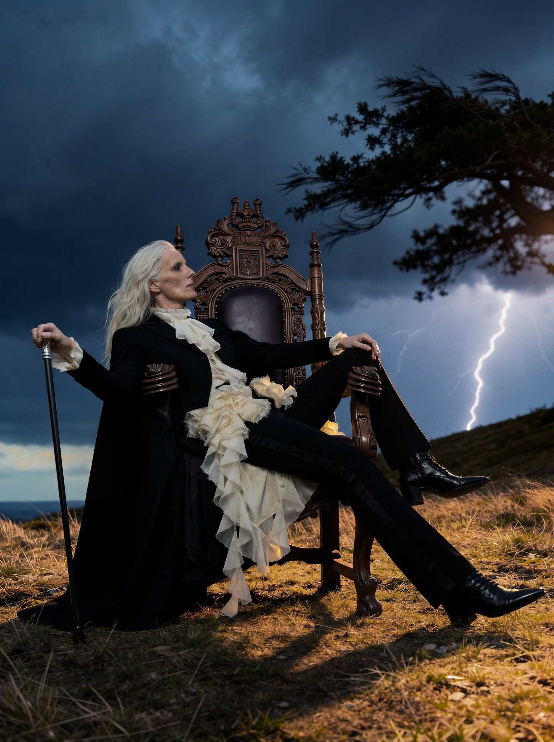 Идея пришла от образа McQueen осень-зима 2025 — чёрный кейп с каскадным жабо. Захотелось поместить его не на подиум, а в стихию. Женщина в кресле посреди грозового поля — не жертва бури, а её хозяйка. Платиновые волосы, трость, молния на фоне. Никакого бегства.