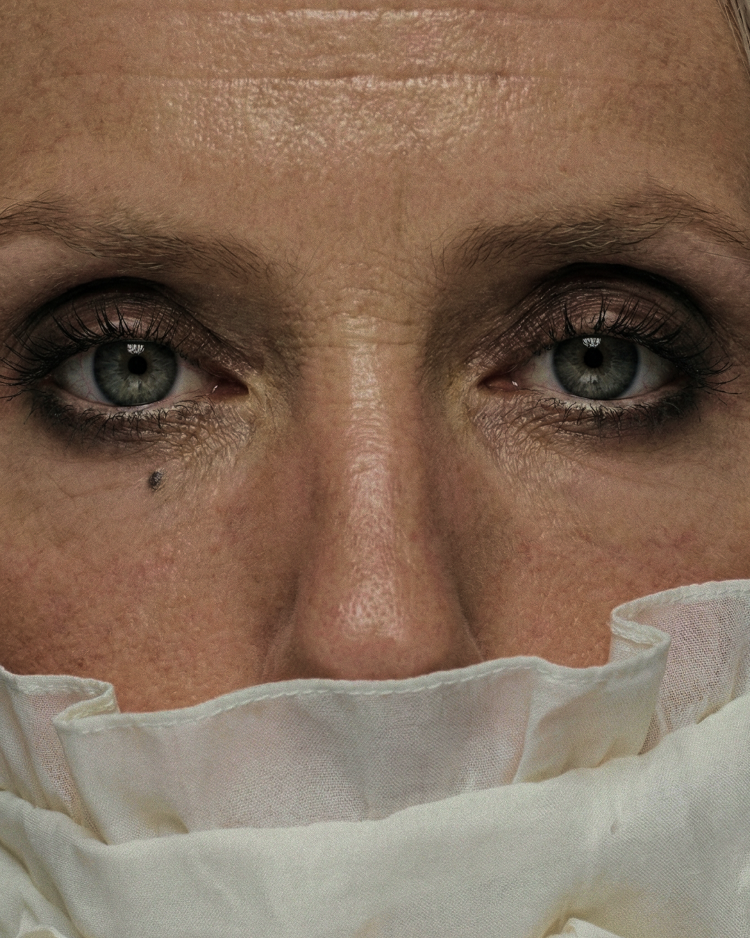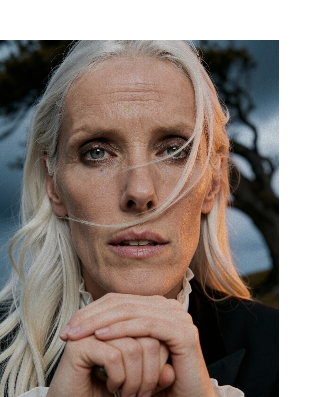 Работа началась с кастинга — подбирали типаж через Midjourney: зрелая женщина 35+, сильные черты лица, платиновые волосы, серо-зелёные глаза. Затем отдельно собирали сцену: холм, дерево, кресло, молния. Главная борьба — убрать тёплый жёлтый свет с земли и добиться холодной грозовой температуры кадра.